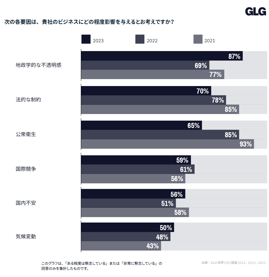 GLGの過去2年の調査では、ビジネスに最も影響を与える可能性が高い要因として「新型コロナウイルス感染症」が挙げられていました。今年は、約90%のCEOが「地政学的な不透明感」を最大の懸念事項として挙げています。言うまでもなく、これにはロシアのウクライナ侵攻が影響しています。