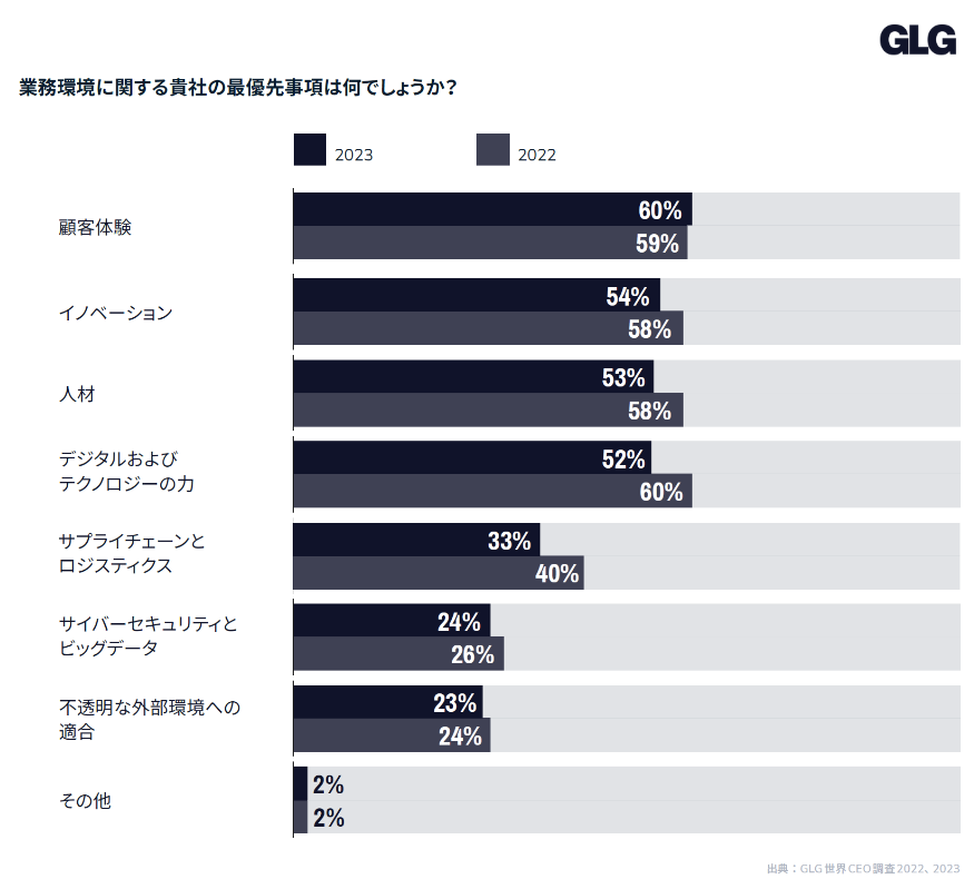 2023年の最優先事項について、調査に参加した世界各国のCEOから最も多くの回答を集めたのは「顧客体験」(60%)でした。