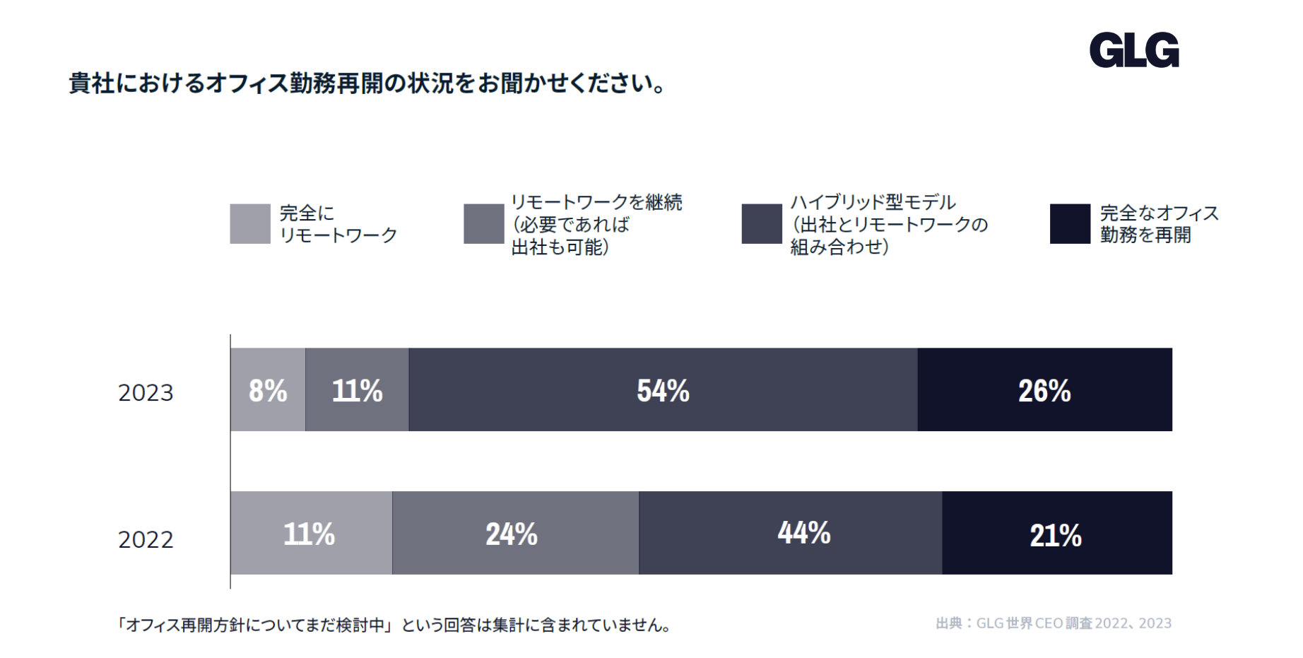 回答者したCEOの4分の3近くが、「何らかの形で在宅勤務制度を導入している」と回答しました。昨年の79%からわずかに減少しました。
