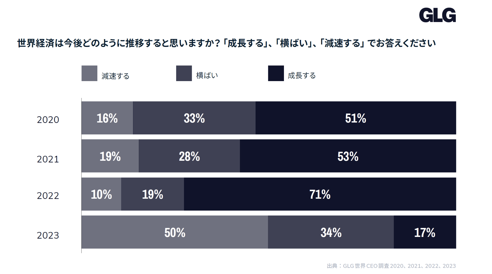 2022年までの調査では、その大半がコロナ禍で実施されているにもかかわらず、世界のCEOは自社の収益増や世界経済の成長を楽観視していました。2023年の調査では一転し、今年自社の収益が「増加する」と確信しているのは46%(昨年比22ポイント減)にとどまりました。また、50%のCEOが世界経済は「減速する」と回答しており、世界的な景気後退や不安定な社会情勢を背景に、悲観的な意見が目立つ結果となりました。