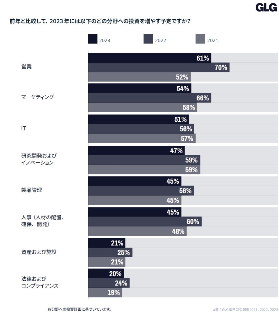 本調査は、GLGのサーベイチームによって実施、解釈、分析されています。調査パネルは、GLGの世界最大級の有識者ネットワークの中から、様々な業界、国のCEO(GLGアドバイザー)を含むよう選定されています。