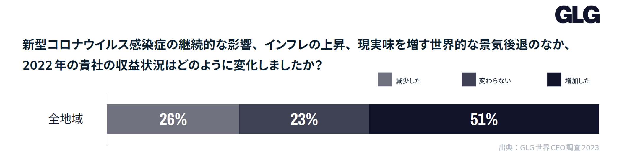 いくつもの世界的な課題が同時に発生しているにもかかわらず、調査に回答したCEOの半数以上が「2022年に収益が増加した」と回答しています。減少が見られたのはわずか26%でした。