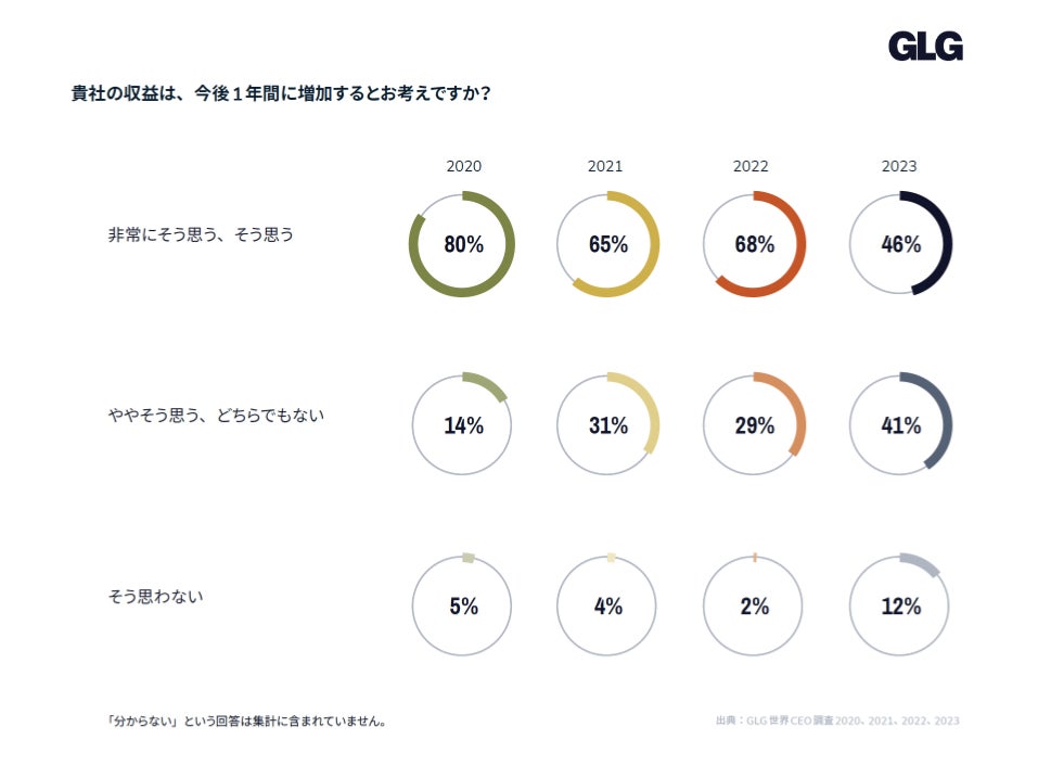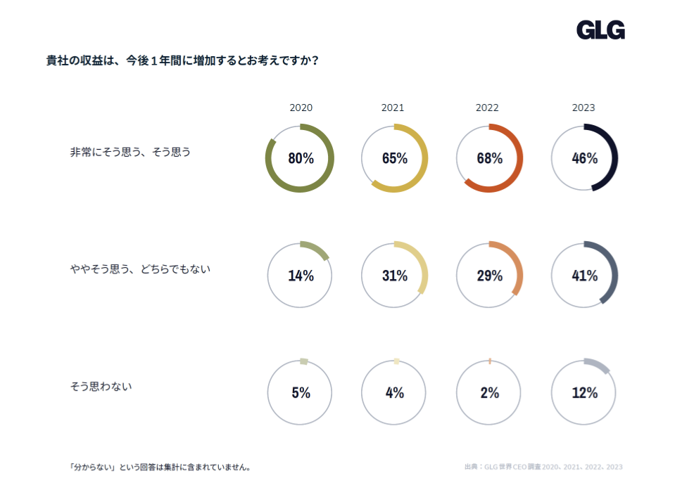 GLGのこれまでの調査で見られた楽観的な見方から一転して、2023年に収益が増加すると考えているかについて「非常にそう思う」または「そう思う」と回答したCEOは46%のみでした。