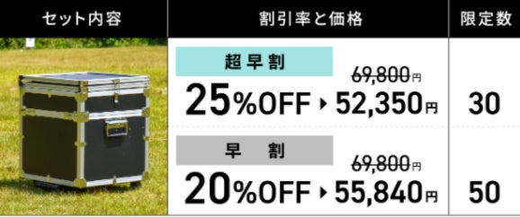 「Campers Kitchen Box」は、現在定価69,800円から【25%OFF】の『52,350円』で、先着30名様限定で提供中です。この超早割価格は数量限定であり、GREEN FUNDINGの規約により、終了後はこれよりお得な価格で提供することはできません。ぜひ、この機会をお見逃しなく!