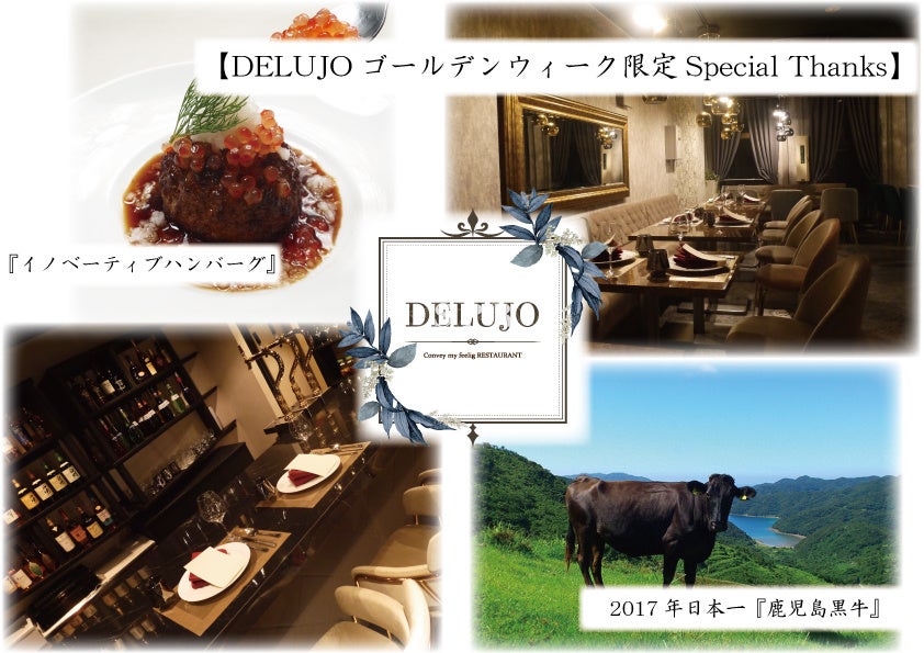自由な発想が織り重ったDELUJOならではの、一期一会のお客様に合わせたメニューをゴールデンウィーク限定でThanks Priceでご用意。オープン後、ご来店頂いたお客様、まだ頂いていないお客様も是非この機会に『サプライズ×美食』の非日常体験をご堪能ください。