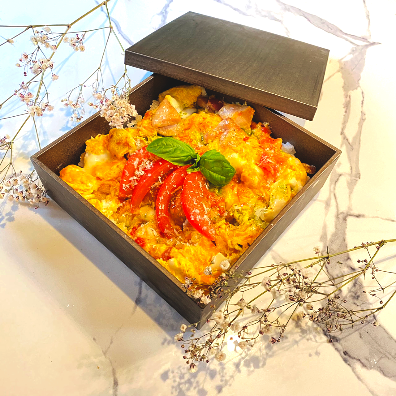 濃厚なコクが特徴で飽きのこないクセになる味わいが特徴のたまごをふんだんに使用し、卓上でフラッペしながらグラナパダーノチーズ・ペコリーノロマーノのチーズ2種とあえて、ローマ風カルボナーラをご用意しております。濃厚な卵の旨味をダイレクトに感じれる一品です。