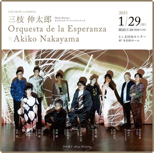 公益財団法人としま未来文化財団(所在地:東京都豊島区、理事長:高野之夫)は、2023年1月29日(日)に、東京建物 Brillia HALL(住所:豊島区東池袋1-20-10)にて、LIVE MUSIC in HAREZA「三枝伸太郎Orquesta de la Esperanza×Akiko Nakayama」を開催します。