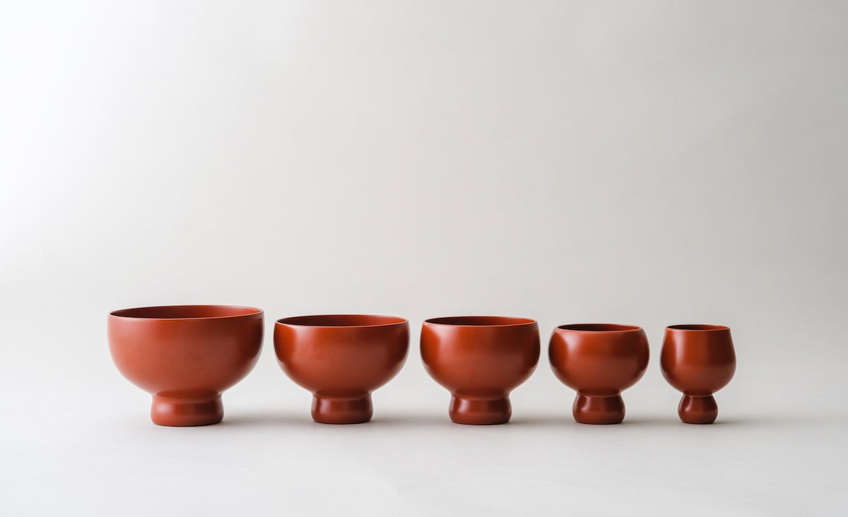 かつて人の手の大きさを基準に計られていた「升」という量の単位を取り入れ展開される5つのサイズ、また漆器の代表的なイメージである「朱・黒」を、現代の暮らしの中に違和感なく溶け込むために再解釈した新しい2色のカラーバリエーション。