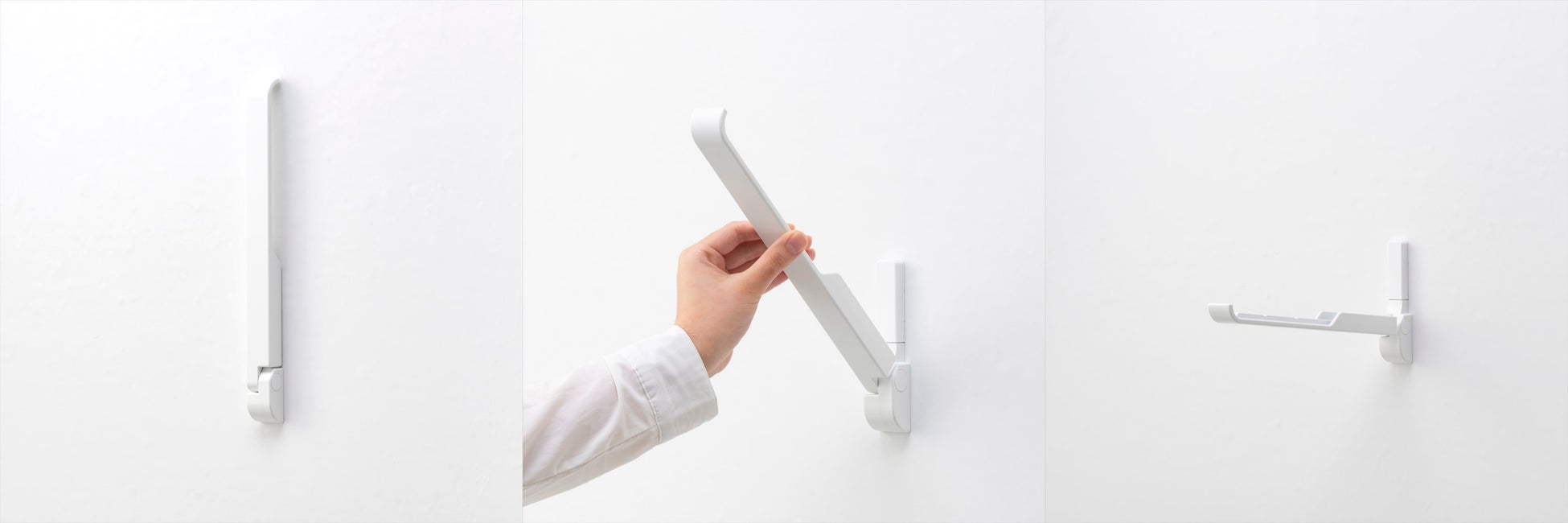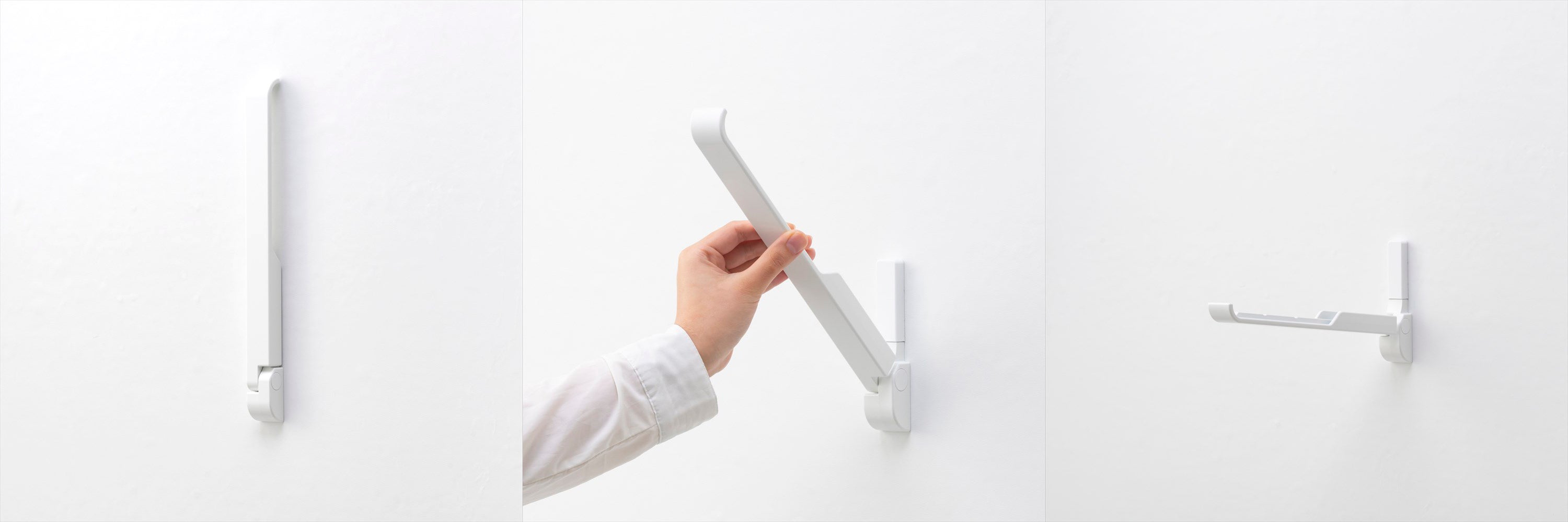 室内の壁面に取り付ける物干し製品です。部屋の壁面を物干しスペースとして確保します。室内空間との調和に配慮する為、機能性を備えたシンプルな形状にこだわりました。特に収納時は物干し用具であると思わせない、空間に溶け込む存在としています。また作動において「眠っている赤ちゃんを起こさない」を目標に静かな作動音を実現しています。