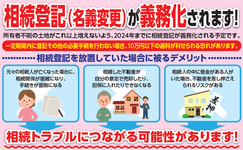 少子高齢化・多死社会化が進むとされる現代において、相続対策・生前対策という考えは非常に身近となってきたように思います。人間である以上、誰しもに必ず人生のゴールが訪れ、相続手続きが必要となりますが、昨年、とうとう不動産に関する相続手続き(所有件移転登記)の義務化が決定いたしました。誰の身にも起こり得る相続手続き、その新たな法制度について、国民一人一人が正しい知識を得ることは非常に重要なことだと考えております。