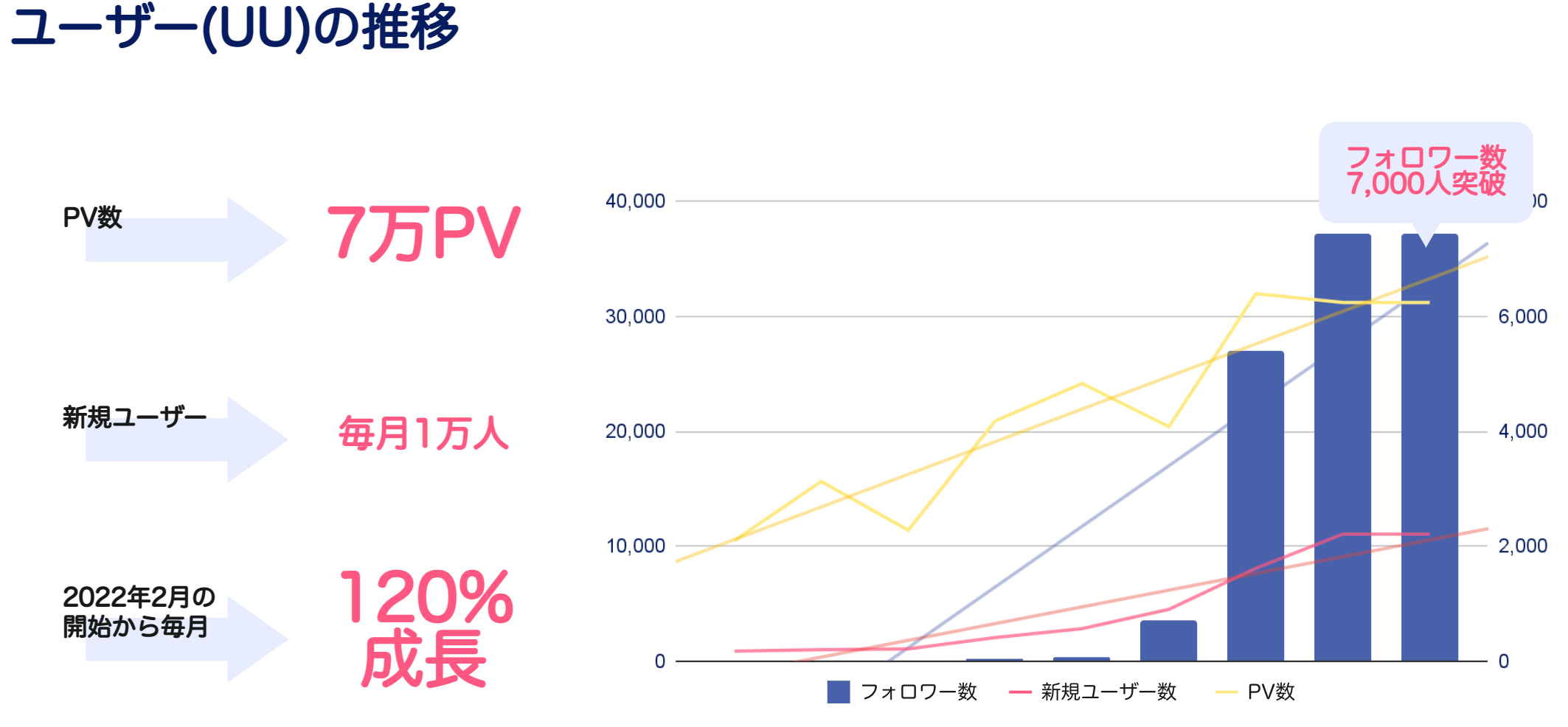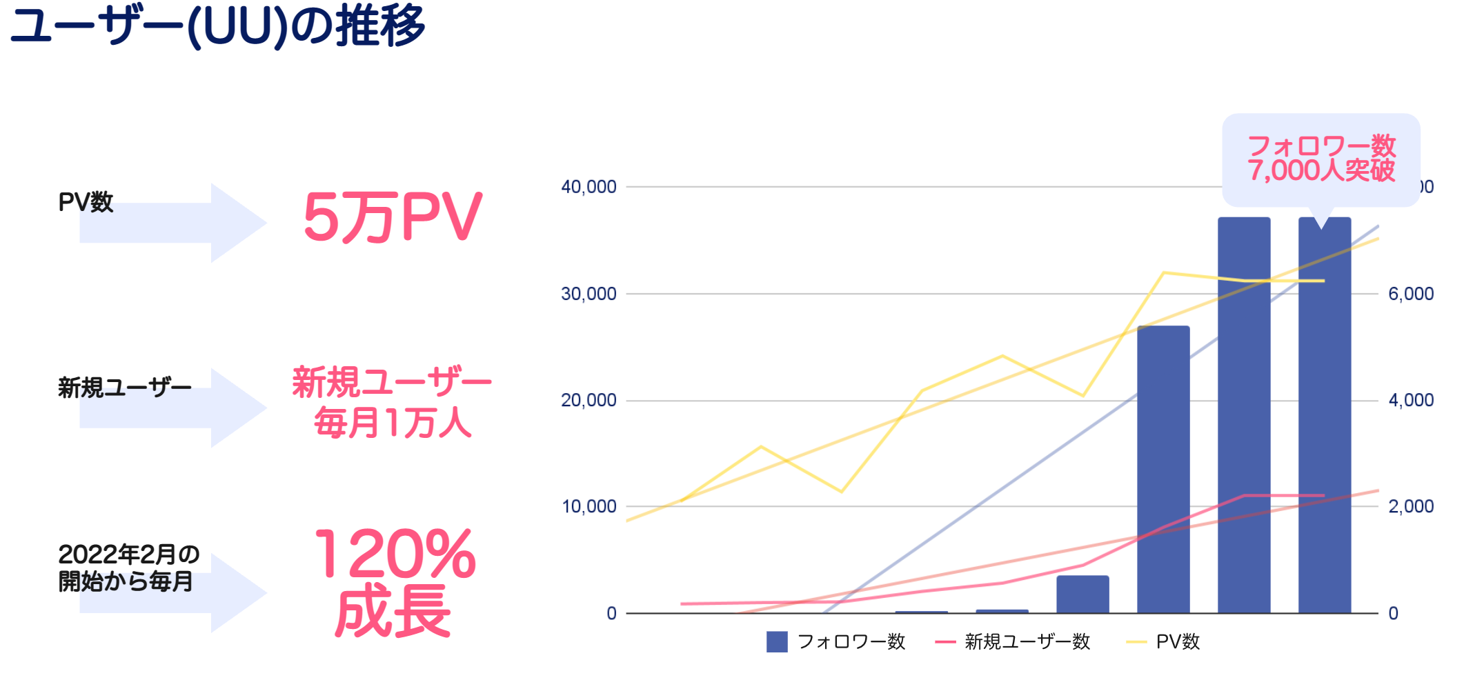 ワープシティは2022年2月にサービスを開始し、2022年11月現在、約9ヶ月で1ヶ月間のアクセス数は7万PV、新規ユーザー数は毎月1万人弱、Twitterフォロワー数は7,000人を突破しております。リリース当初から毎月120%の成長を維持しアクセス数を伸ばしております。