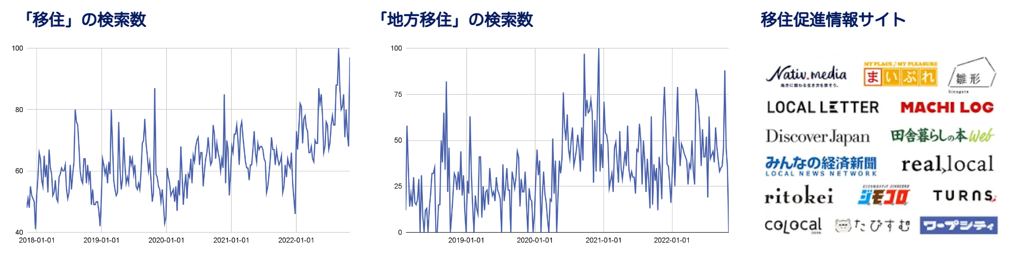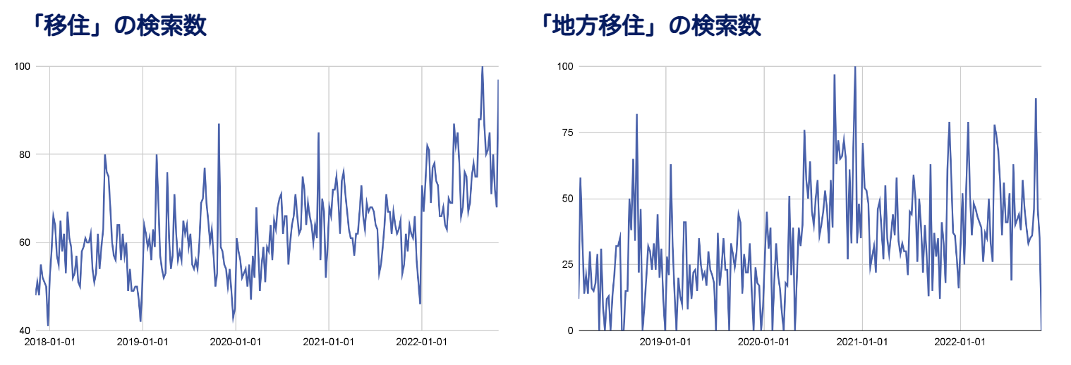 コロナ禍を機に、「移住」「地方移住」での検索数が増加しており、テレビ番組などでも特集が組まれるほどです。移住を促進する情報サイトも増え、移住に興味のある層が増えたといえます。