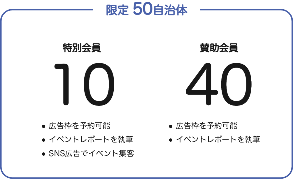 1年間(2023年4月~2024年3月末まで)は、50自治体限定で、会員を募らせていただきます。発信する自治体に上限を設けることで、情報が埋もれにくくなります。限定会員には、サイト内の広告枠を予約できるシステムをご提供いたしまして、目を引く位置にイベント情報などを掲載することができます。