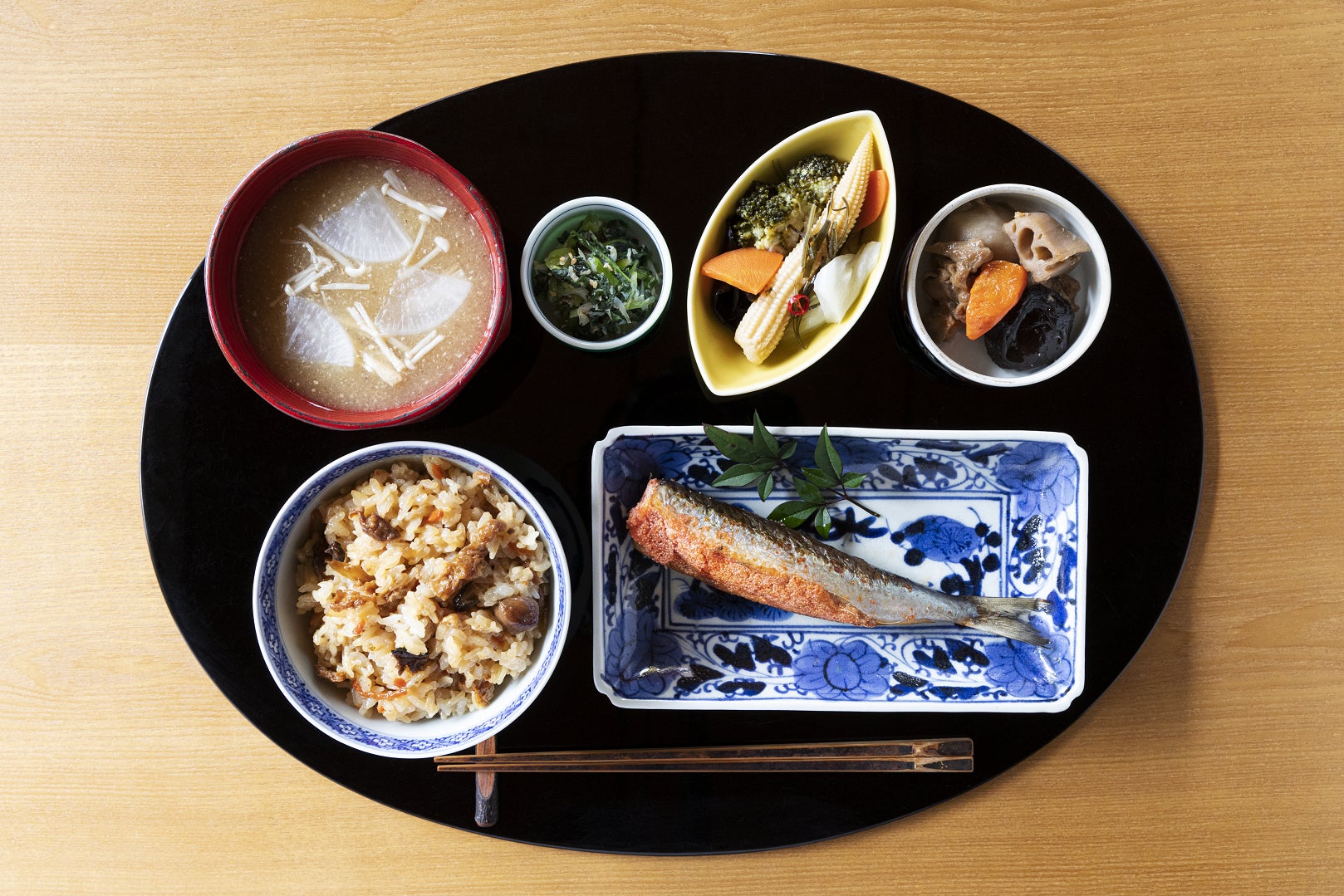 メニュー:①ちりめん竹の子ご飯 ②京さわらの西京焼き ➂京風味噌汁 ④ずいきの炊いたん ⑤大根とゆず皮の甘酢和え ⑥小松菜と京揚げの煮びたし