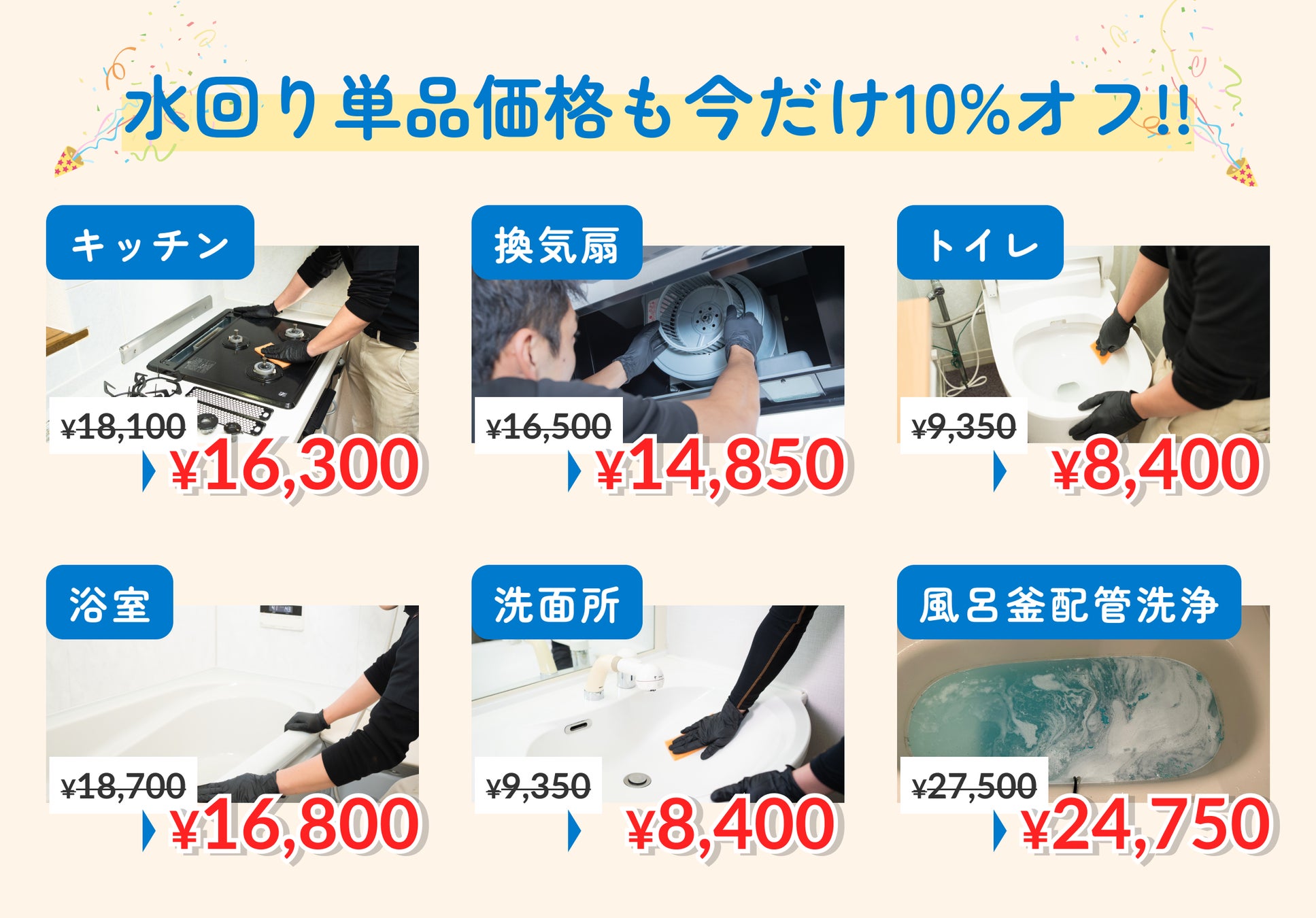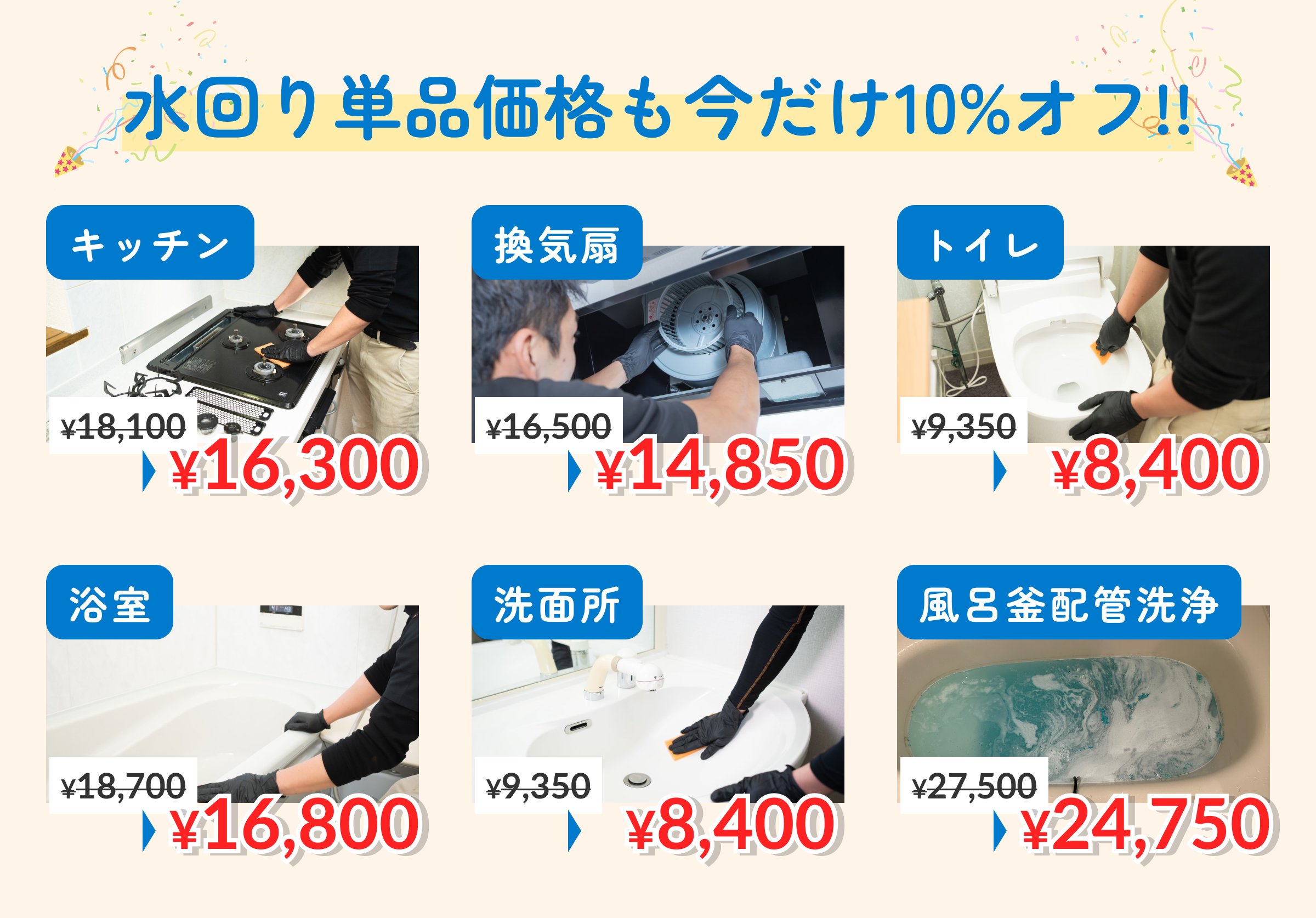 キッチンクリーニング(https://www.pvs-cleaning.com/menu/kitchen)や浴室クリーニング(https://www.pvs-cleaning.com/menu/bathroom)をはじめ、すべての水回りのハウスクリーニングを10%オフでご提供いたします。
