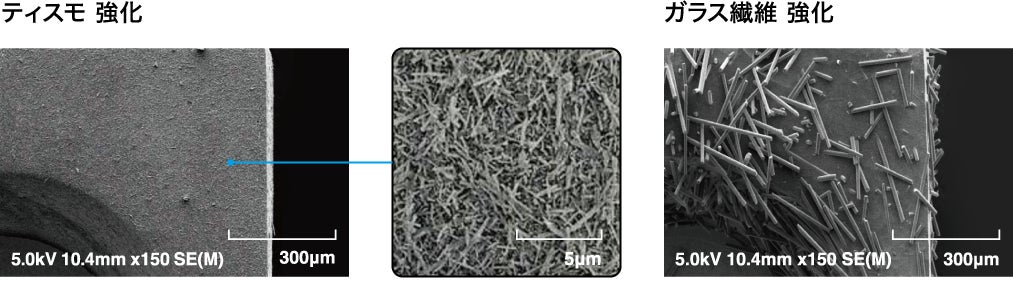 POTICON(Potassium Titanate Compound)は、大塚化学株式会社が開発したチタン酸カリウム繊維材料、TISMO(ティスモ)をプラスチックと混ぜ合わせた機能性樹脂複合材料です。ガラス繊維の数千分の1というミクロ繊維であるTISMOは、高い強度と剛性を持ちながら寸法安定性があり、樹脂に混ぜることで超薄肉成形が可能になります。エンジニアリングプラスチックとして、ミクロ補強性や高強度、高摺動性が求められるパーツに採用されています。従来、射出成形や切削加工で利用されてきたPOTICONを新たに3Dプリンターで利用可能にしたのがPOTICON FILAMENTです。