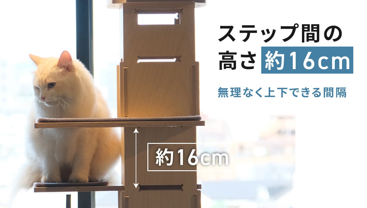 子猫からシニア猫まで無理なく上り下りできるよう、ステップ間の高さは約16cmに設定しています。年齢によって変わる足腰の負担を考慮した、どの猫にもやさしい設計です。