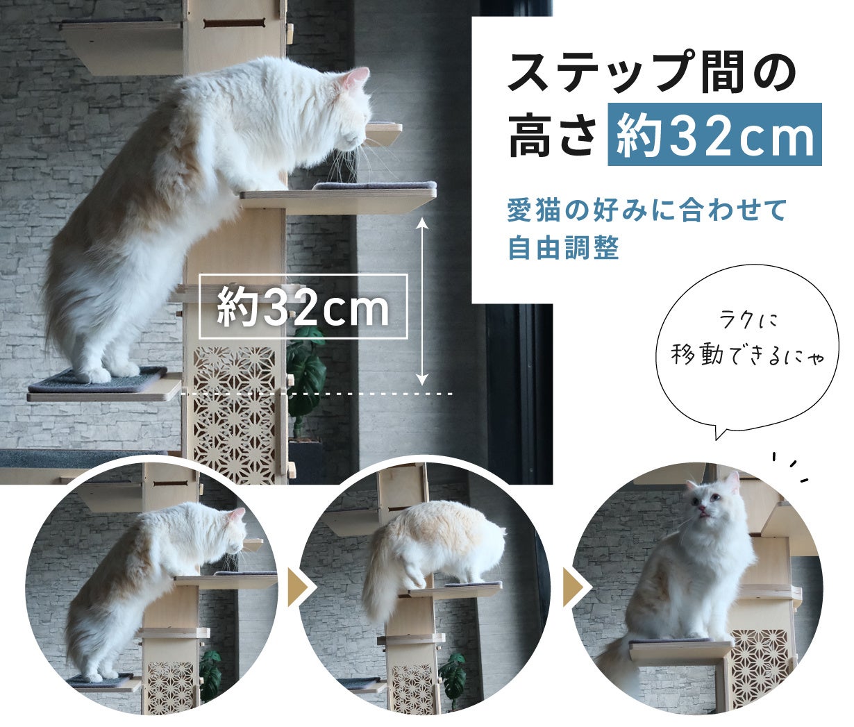 また、猫の平均的な跳躍距離は約40cmと言われており、愛猫の運動量や好みに合わせてステップ間を広げて設置することもできます。