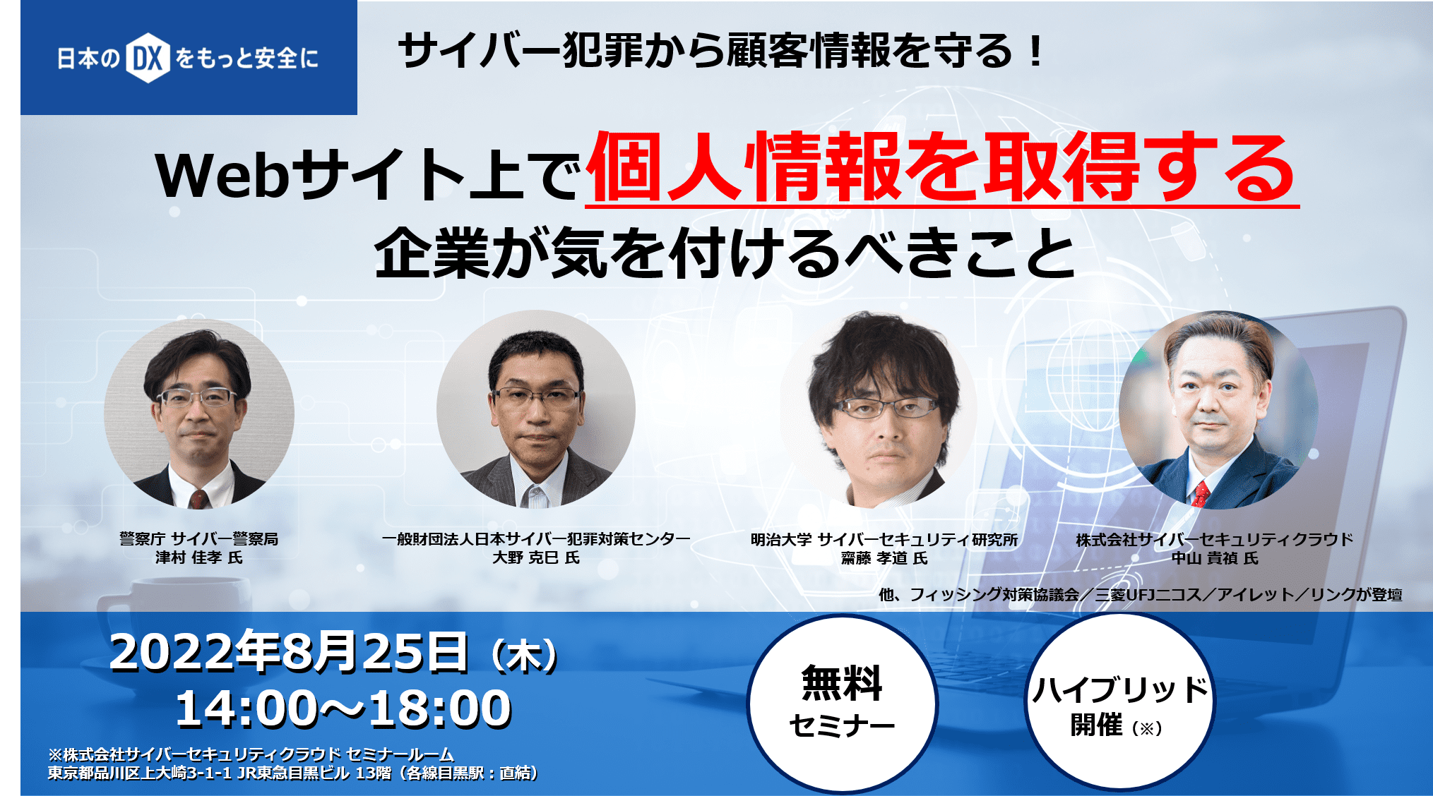 セキュリティ連盟は、深刻な社会問題であるサイバー攻撃への「対策の重要性」を啓発するべく、2022年8月25日(木)に『サイバー犯罪から顧客情報を守る!Webサイト上で個人情報を取得する企業が気を付けるべきこと』セミナーを開催いたします。