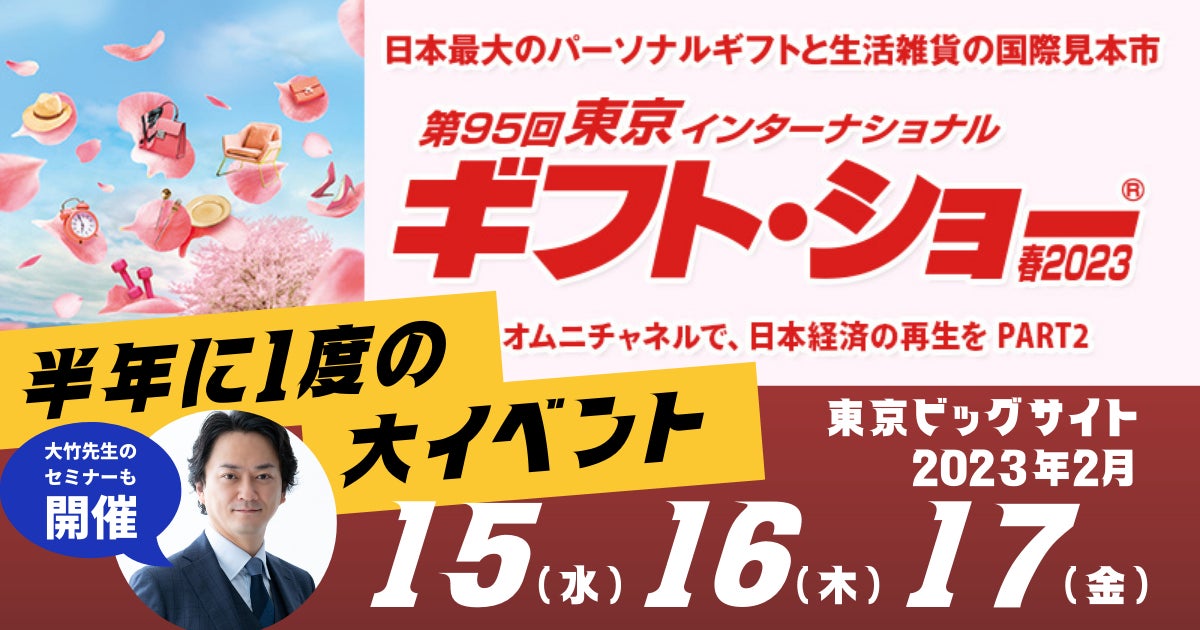 3大クラウドファンディング、Makuake・CAMPFIRE・GREENFUNDINGの史上唯一の公式パートナーでもあるクラファン物販の第一人者の大竹秀明が、来月開催される「第95回東京インターナショナル・ギフトショー2023春」にて3回目のセミナー講演をいたします。