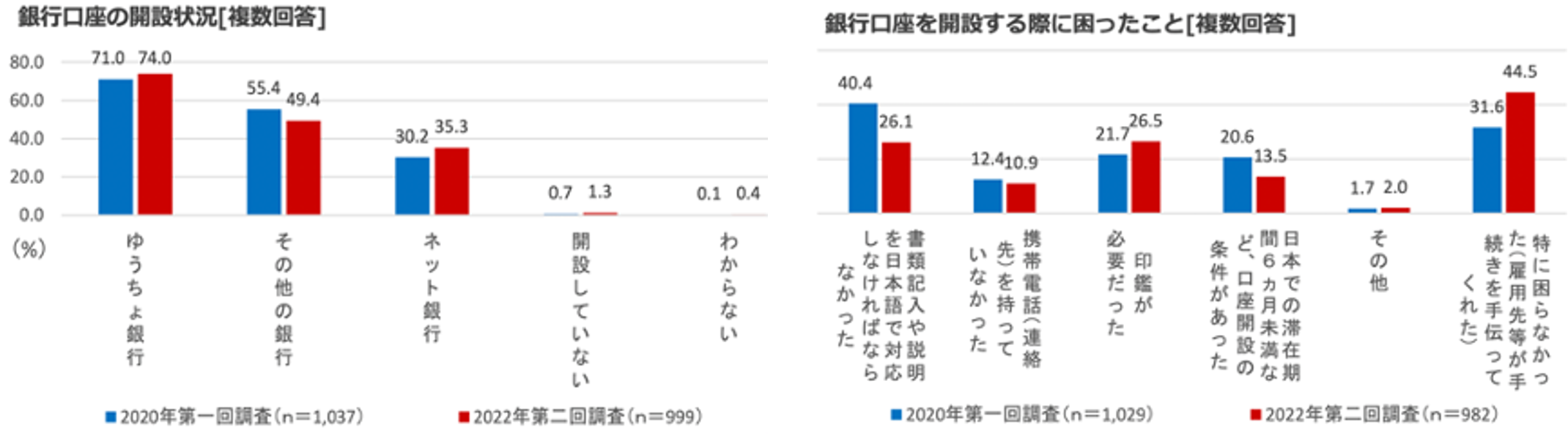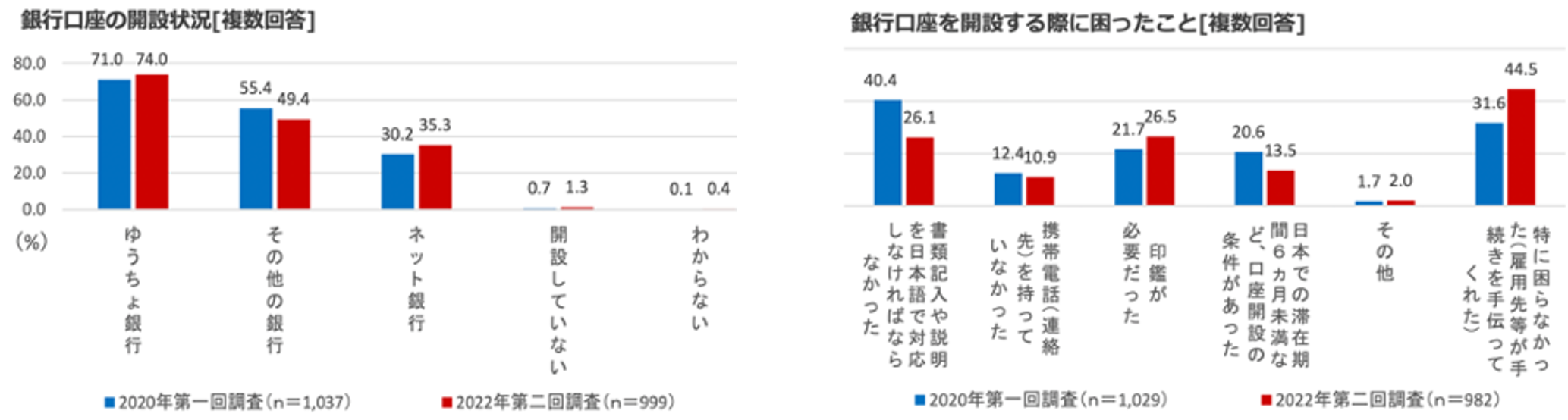 また、「在留外国人の金融機関利用について※2」の調査によると、自分名義での口座開設は「ゆうちょ銀行(74.0%)」がトップで、次いで「その他の銀行(49.4%)」、口座開設で困ったこととして「日本語で対応しなければならなかった」や「印鑑が必要だった」などが挙げられています。トップに挙がっている「困らなかった」の回答も雇用先の手助けが必要であり、自力での銀行口座を持つことのハードルの高さがうかがえます。