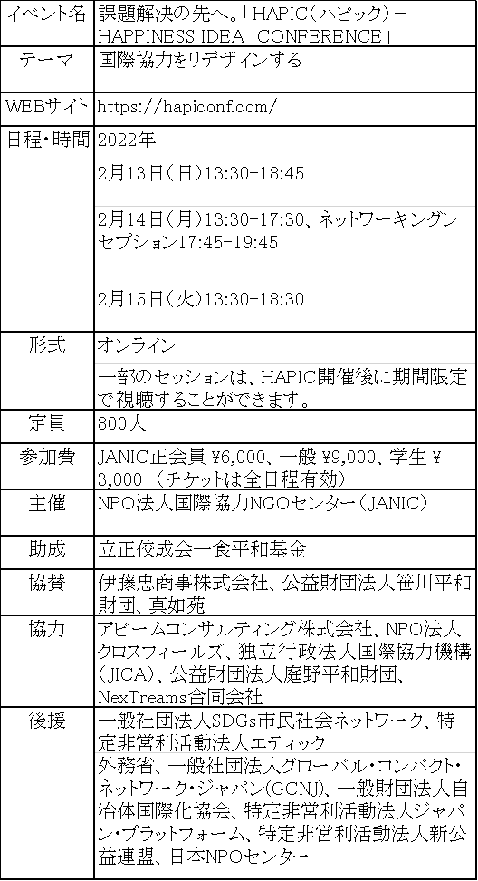 グローバルな社会課題解決に国内外で取り組む日本のNGOを支援する、NPO法人 国際協力NGOセンター(JANIC)(所在地:東京都新宿区、理事長:本木恵介)は、2022年2月13日(日)~15日(火)の3日間、グローバルな社会課題について考えるカンファレンス「課題解決の先へ。HAPIC(ハピック)-HAPPINESS IDEA CONFERENCE 2022」 をオンラインで開催します。