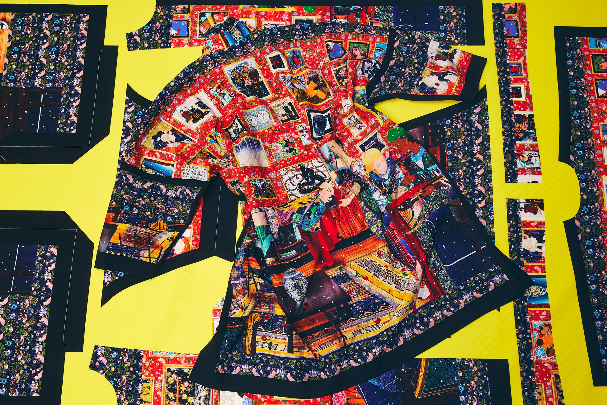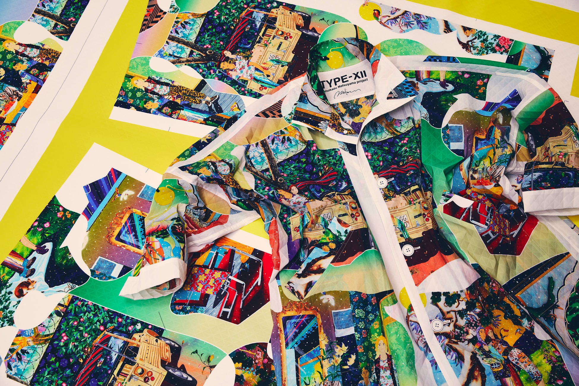 松山智一と「A-POC ABLE ISSEY MIYAKE」の共同研究ともいえるべきコートとTシャツは、三宅一生が提唱した「一枚の布」のコンセプトをさらに発展させていくブランドA-POC ABLE ISSEY MIYAKEのデザインと、松山智一がとらえる多面的なイメージの描写が融合した纏う立体作品です。アートとファッションの融合による新しいクリエーションの可能性を示しています。