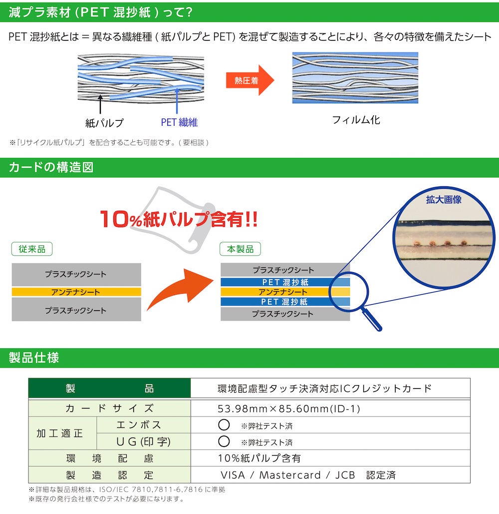 そのような背景から長年、プラスチックカードを市場に提供してきた昌栄印刷におきましてもPET混抄紙材を使用した環境配慮型ICカードの開発・製造・販売を行ってまいりました。
