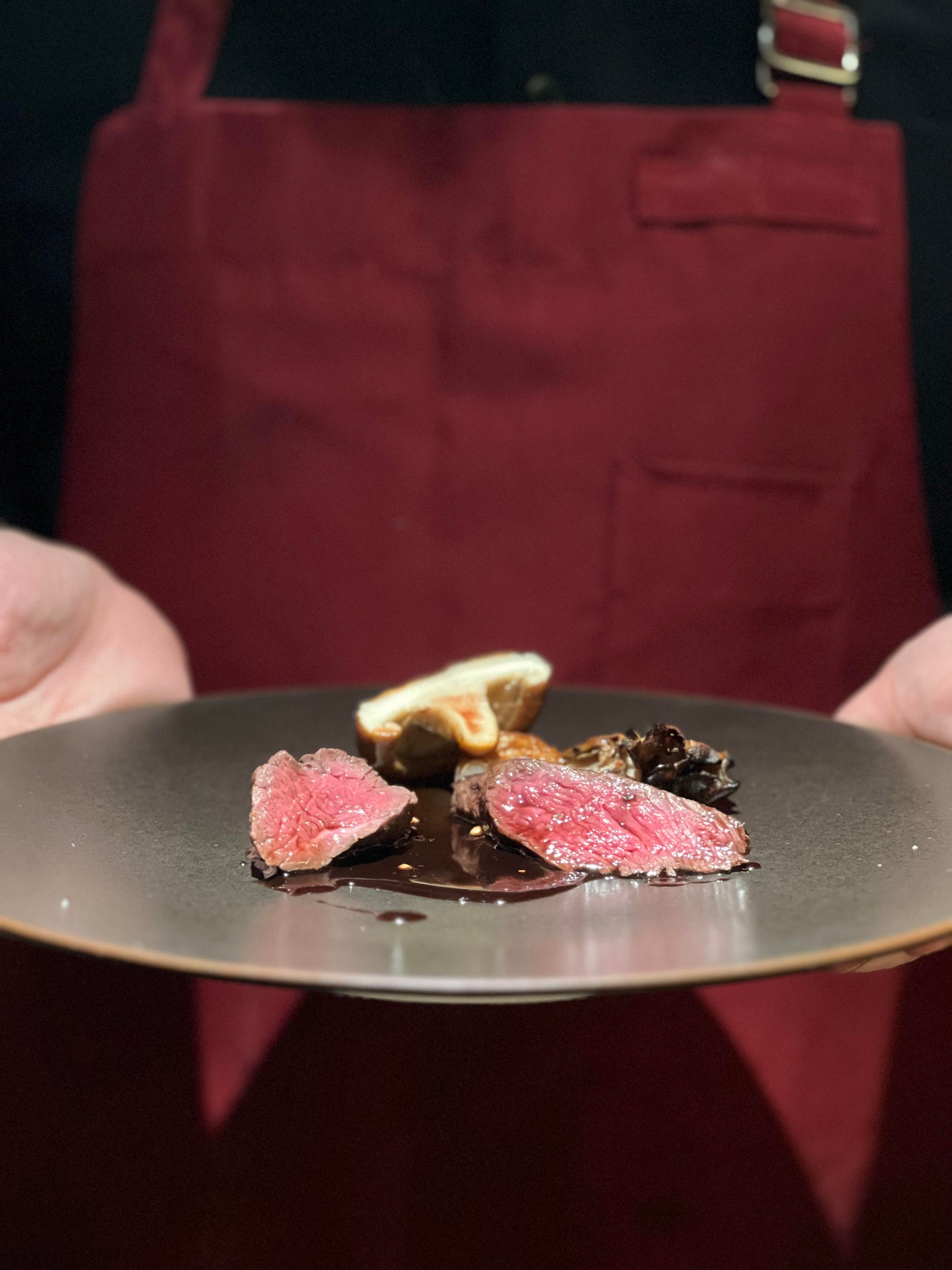 写真:メインの一皿 北海道産仔熊のロースト 仔熊のジュとマデラ酒のソースで