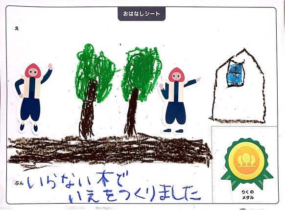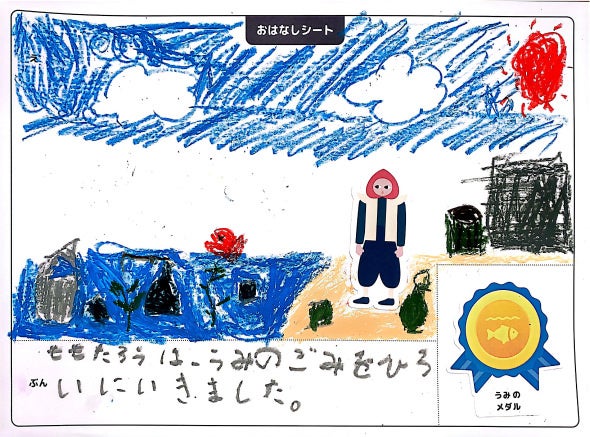 3. 最後に、それぞれの絵と文を見せながら「続きの場面」と「SDGsメダルとどんな関係があるか」を発表して終了です。ももたろうの行動が地球のどのような未来に繋がるか、ぜひお子様と一緒に考えてみてください。