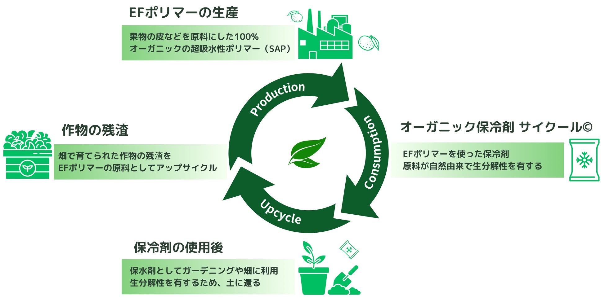 今回、EFポリマーは岩谷産業とそのグループ会社である岩谷マテリアルとの共同で自然由来の原材料をもとにした保冷剤「サイクール©」を開発しました。オレンジやバナナの皮など、従来廃棄されてきた作物残渣をアップサイクルして生まれた、これまでにない保冷剤です。本製品の中身は完全生分解性を有するため、保冷剤の使用後に不要となった場合には庭や観葉植物のポットの土に混ぜることで、一定期間を経て完全に土に還ります。本製品は既に国内大手小売店への納入が決定しており、今後両社はさらに国内市場での普及を図ります。