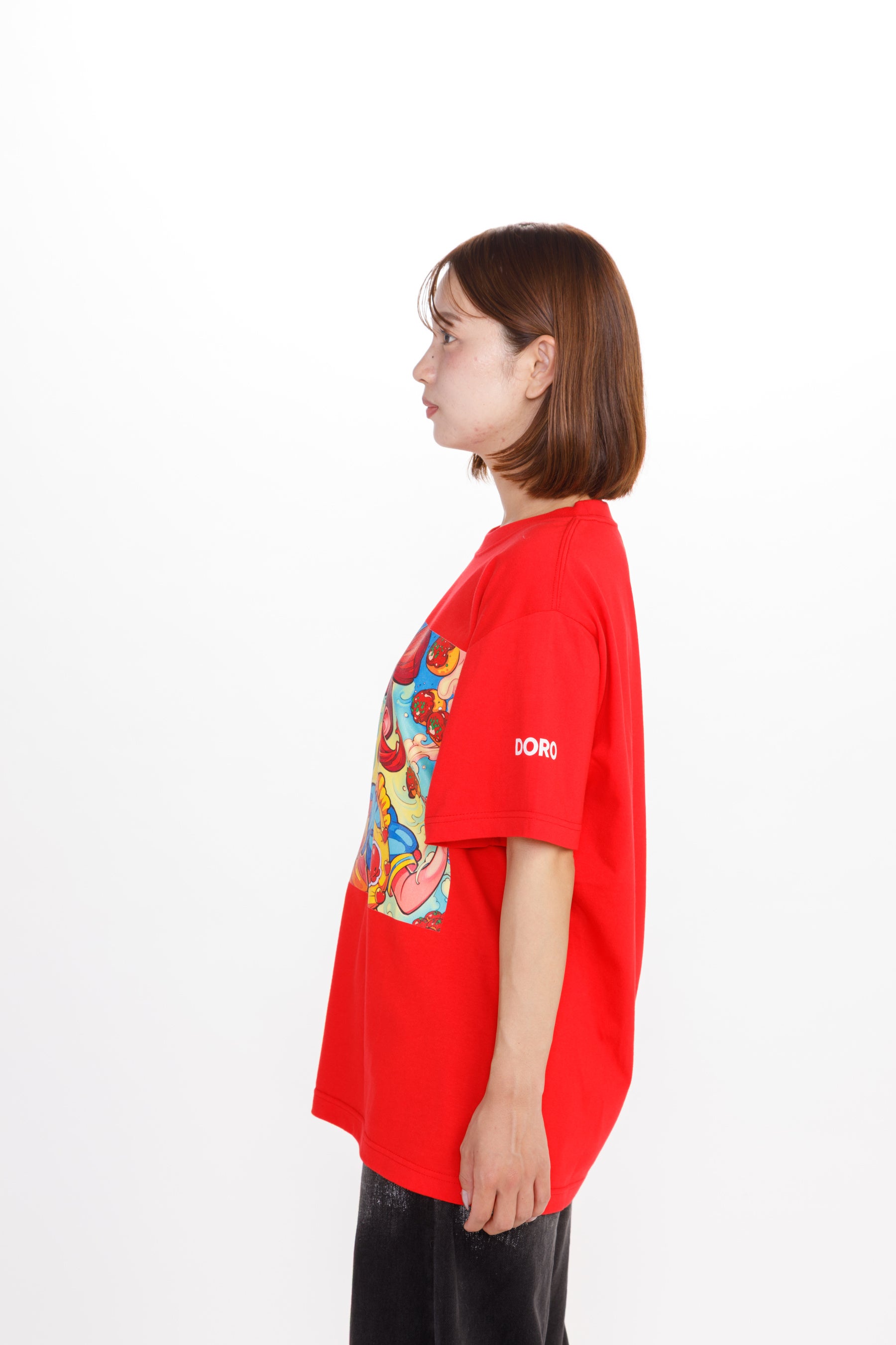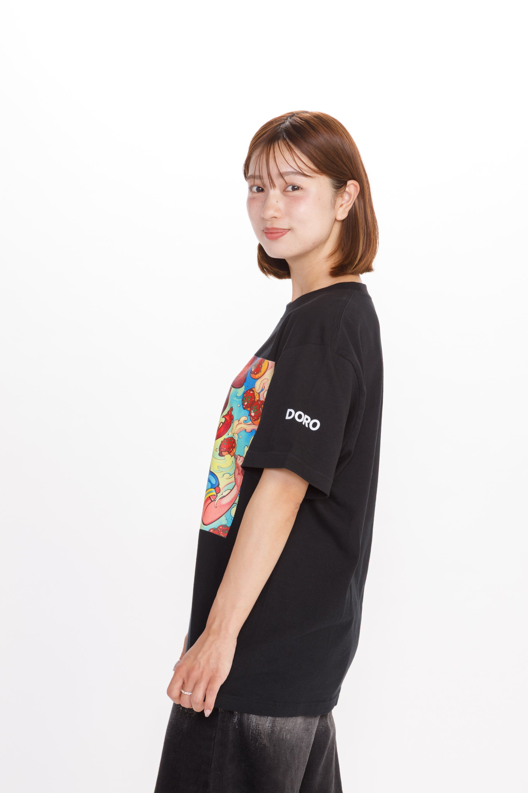 フロントには、どろソースを手にした同店のイメージキャラクター「こたこちゃん」を大胆にプリント。袖口には“DORO”の文字をあしらい、ポップかつストリート感のあるデザインに仕上げています。デザインを手がけたのは、Instagramフォロワー16万人以上を持つ世界的タトゥーアーティスト・彫紅氏。アート性の高いビジュアルが、食文化とストリートファッションをつなぎます。