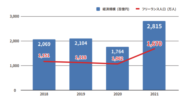 新型コロナウィルスの影響もあり、働き方やライフスタイルの多様化が急速に進む中、副業 を含めたフリーランスという働き方を選択する人たちが増えてきており、今後もその流れは 加速していくものと考えられます(フリーランスの数は「フリーランス実体調査 2021」よ り、2020 年から 2021 年にかけて 1.6 倍ほどに増加しています)。
