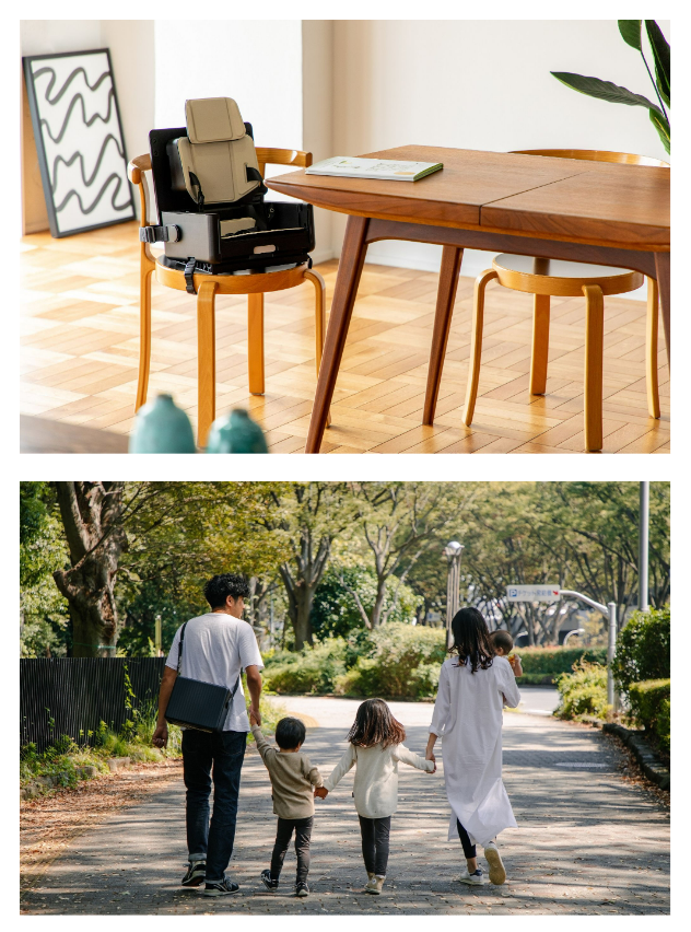 ワンタッチで折り畳みが可能で室内外問わず持ち運んで使える乳幼児向けチェア。外出先では車椅子や専用バギーに座るしかなかった肢体不自由児とその家族の体験から学び開発。障害の有無に関わらず座位が安定しない乳幼児が心地よく座れるように設計したシート形状、床置き・大人用の椅子(座席)にも簡単に設置できる仕様およびニュートラルで洗練されたデザインにこだわり。
