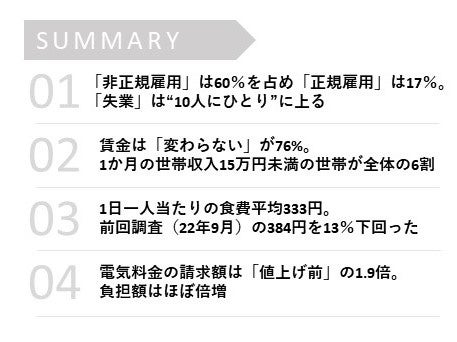 ■「非正規雇用」は60%を占め「正規雇用」は17%。「失業」は“10人にひとり”