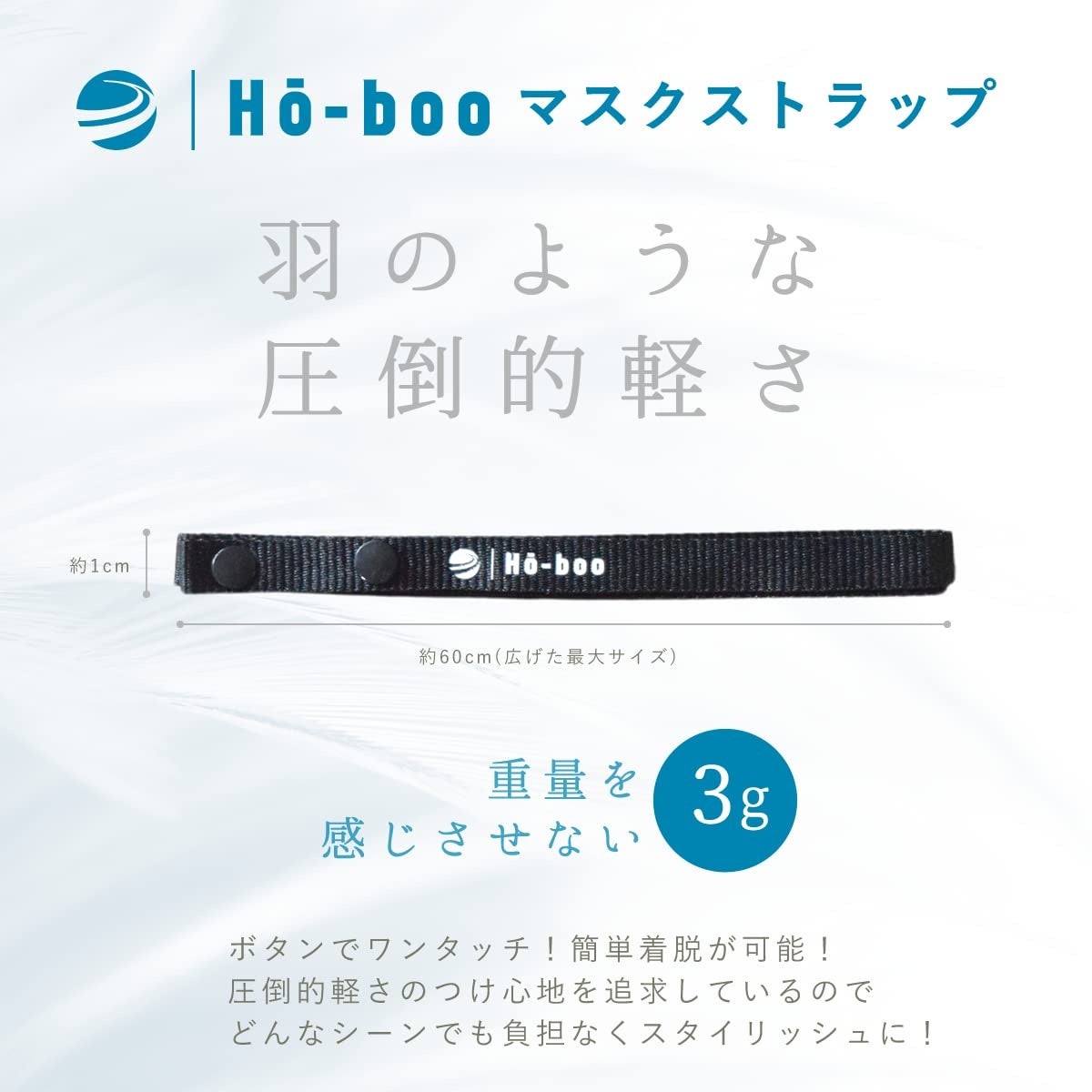 わずさ3gで重量を感じさせないスナップボタンを採用し、マスクへの着脱もワンタッチ!
