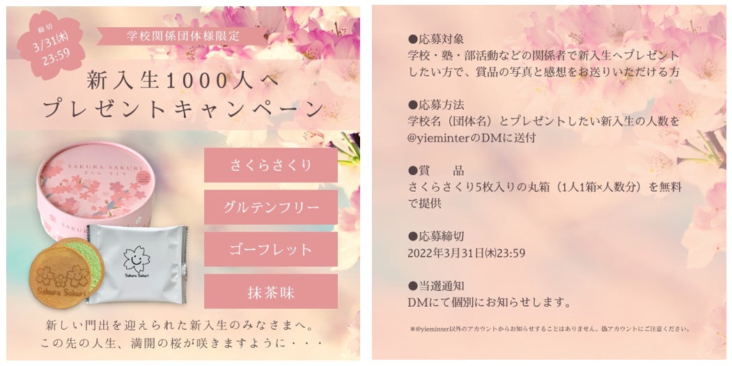株式会社イームインターナショナル(所在地:東京都港区、代表取締役:田中 明人)は、イームプロジェクト2020【ものづくり編】『Twitterフォロワーのみんなとものづくり企画』から生まれた商品、「さくらさくり~玄米粉で焼き上げたグルテンフリーゴーフレット 抹茶味~」をこの春、入学される学生の皆様にお祝いの気持ちを伝えるプレゼントとして、さくらさくり丸箱を1人につき1箱を無料で提供致します。