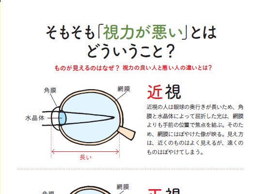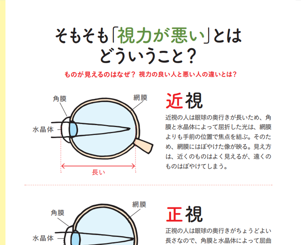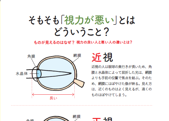子どもは「ものが見えにくい」ことをうまく表現できないため、保護者の方へ向けたチェック項目を掲載。また、そもそも「視力が悪い」とはどういう事か、見える仕組み、視力の良い人と悪い人の見え方の特徴などを学ぶことができ、目に関する「なぜ?」が解決できる内容です。
