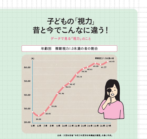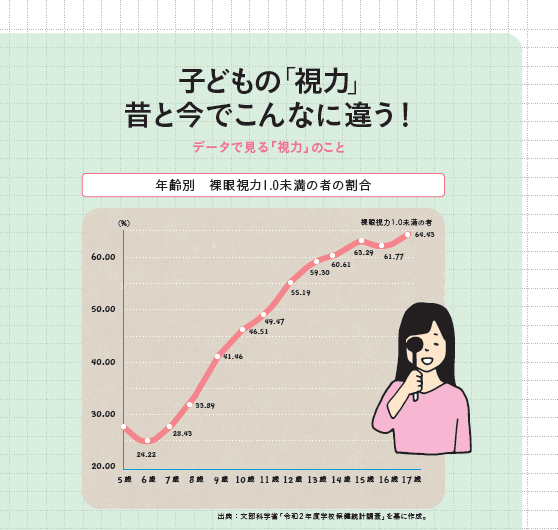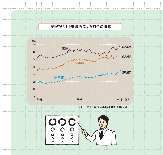 裸眼視力1.0未満の子どもの割合は、小学校入学から年齢が高くなるにつれて増加傾向にあり、1979年と2019年を比較すると、裸眼視力1.0未満の子どもの割合は小学生で約1.5倍になっています。