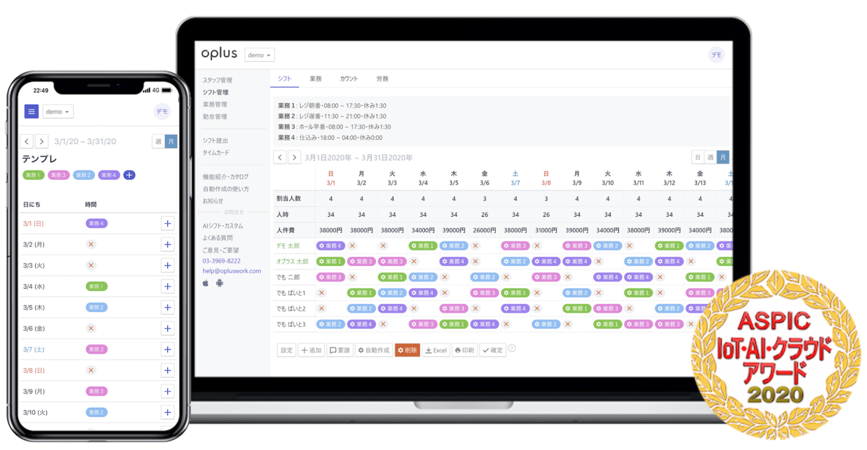 「oplus」はシンプルで直観的な操作性でDXを実現し、ブラウザ・スマホ・アプリの全てに対応したクラウド型シフト・勤怠管理サービスです。様々なシフト管理アプリの中でも群を抜いて無料で使える範囲が大きく、100名様まで無料でご利用いただけるため、紙・エクセルから脱却する上で、手始めに利用しやすいサービスになっています。