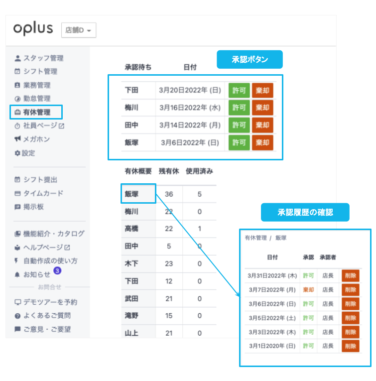 承認方法はoplus管理画面内で「許可」または「棄却」を押していただくだけです。申請結果は対象のスタッフ様へ“メール”と“プッシュ通知”で自動でお知らせされます。また、各スタッフ様ごとの過去の承認履歴も管理画面内で確認していただくことが可能です。