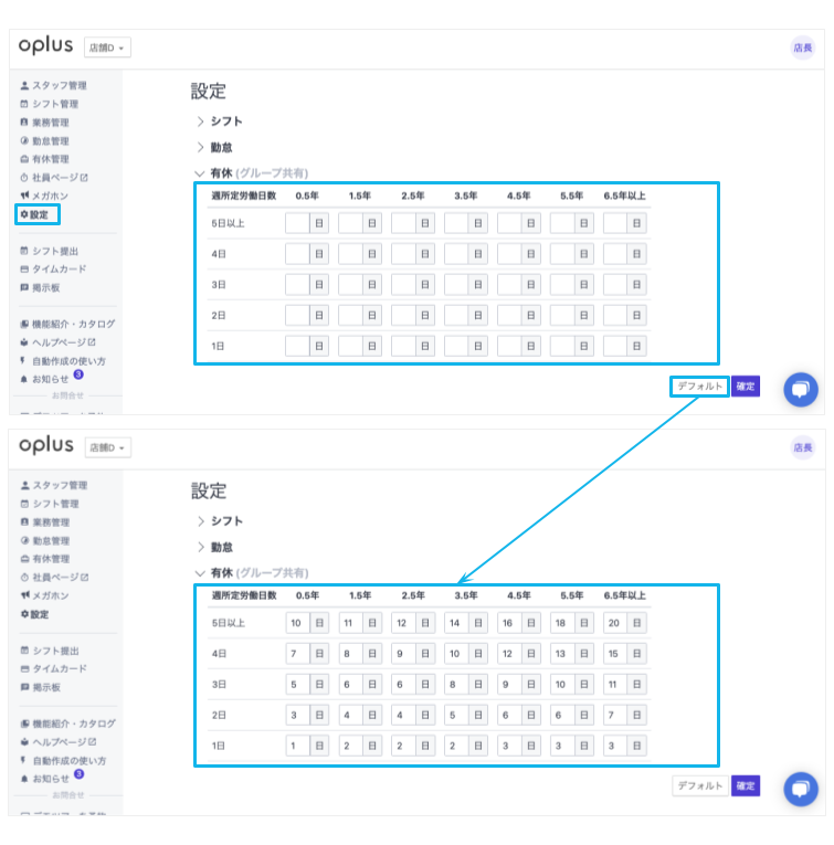 oplusでは、管理画面内で有休付与日数の設定から承認までをスムーズに行っていただくことが可能です。
