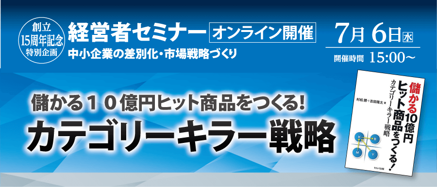 それらの成功事例も含めて、もっと力強く売上が上がる事業にしたいとお考えの中小企業経営者向けに「中小企業の差別化・市場づくり」をテーマとした創業15周年記念・経営者特別オンラインセミナーを7月6日(水)に開催します。
