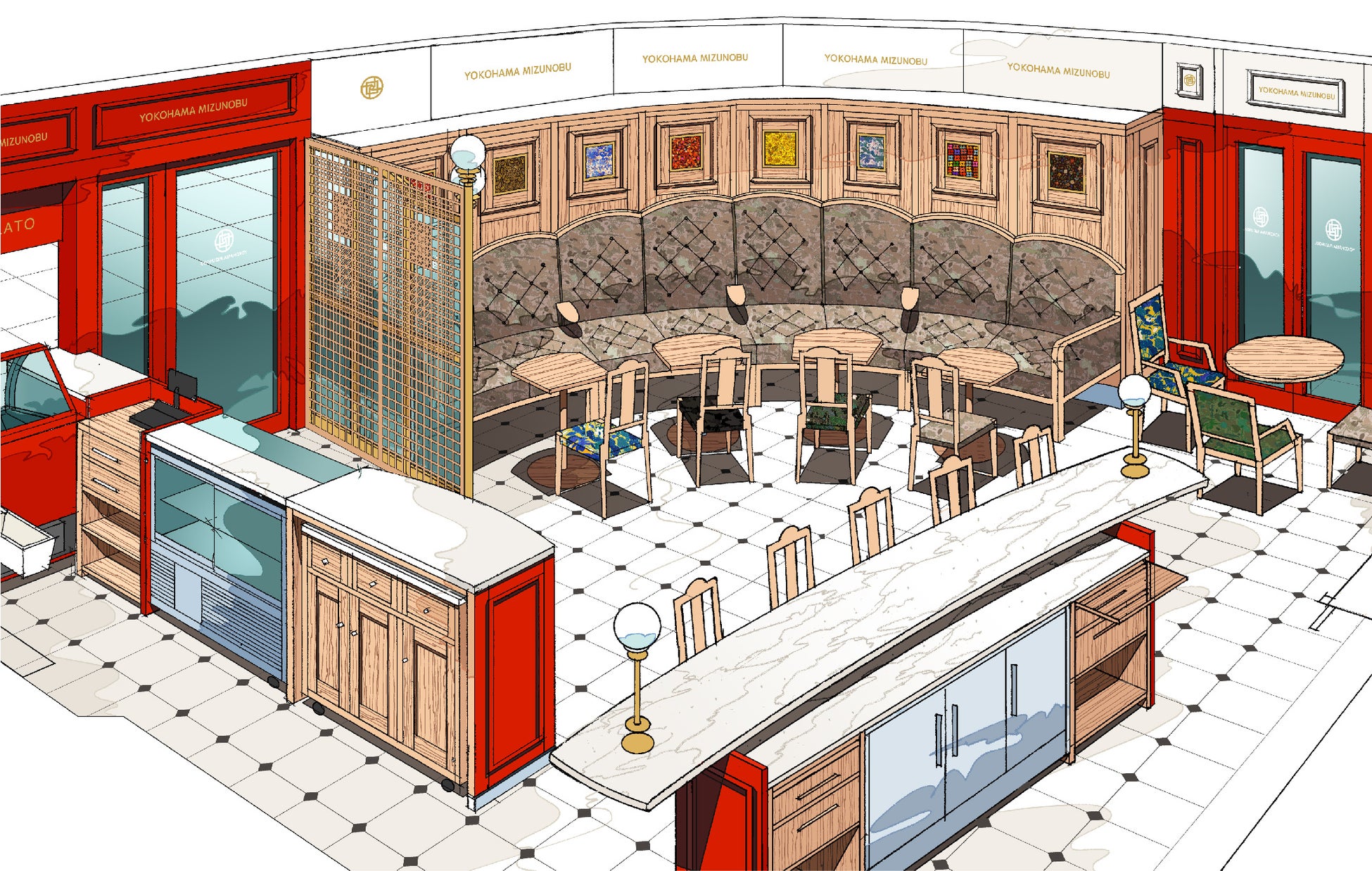 ●フルーツの老舗・水信と縁の深い横浜の港に用意された最高の舞台。水戸岡鋭治氏のデザインする「現代に創るクラシック」を体現した店舗空間。