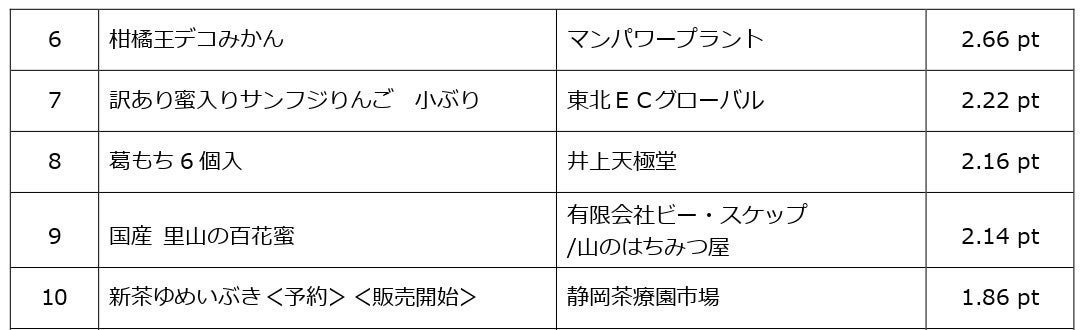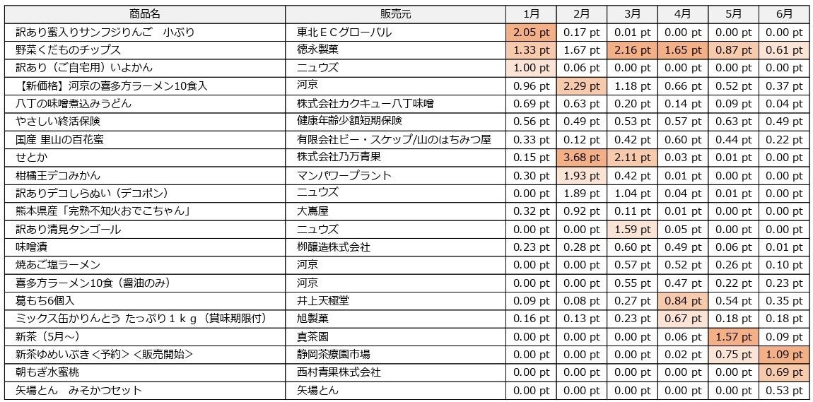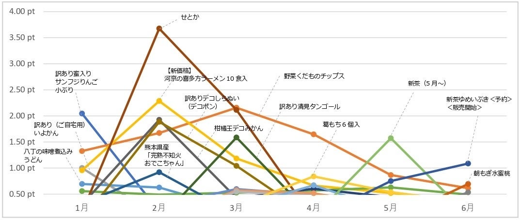 | 1月:旬のりんご(「訳あり蜜入りサンフジりんご 小ぶり」)が大きく問合せ件数を伸ばし、月間問合せ件数1位でした。同様に旬であるいよかん(「訳あり(ご自宅用)いよかん」)は、1月のみ突出して大きく問合せ件数を伸ばしています。寒い時期に食べたくなる味噌煮込みうどん(「八丁の味噌煮込みうどん」)は、1月2月の問合せが多く、なかでも1月は上半期で最も味噌煮込みうどんの問合せが多い月になりました。 2月:柑橘類の(「せとか」)が旬を迎え大きく問合せ件数を伸ばし、2月の月間問合せ件数1位になりました。せとかの2月の問合せ件数は、上半期中、すべての商品の月間問合せ件数の中でも、最多となりました。年間を通じて人気のある喜多方ラーメン(「【新価格】河京の喜多方ラーメン10食入」)は、寒い2月が、最も問合せ件数が多い月となりました。2月は「訳ありデコしらぬい(デコポン)」、「柑橘王デコみかん」、「熊本県産「完熟不知火おでこちゃん」」と柑橘類が旬を迎え、いずれも2月に最も問合せ件数を伸ばしました。 3月:3月から旬を迎える柑橘類である清見タンゴール(「訳あり清見タンゴール」)が、3月に最も問合せ件数を伸ばしました。 4月:初夏の兆しが見え始める4月5月は、葛もち(「葛もち6個入」)が問合せ件数を伸ばし、4月では、月間問合せ件数2位となりました。 5月:季節を迎えた新茶(「新茶(5月~)」)が大きく問合せ件数を増やし、月間問合せ件数1位となりました。 6月:5月にひきつづき新茶(「新茶ゆめいぶき<予約><販売開始>」)が月間問合せ件数1位となりました。また、桃(「朝もぎ水蜜桃」)が問合せ件数を伸ばし、月間問合せ件数2位となりました。 |