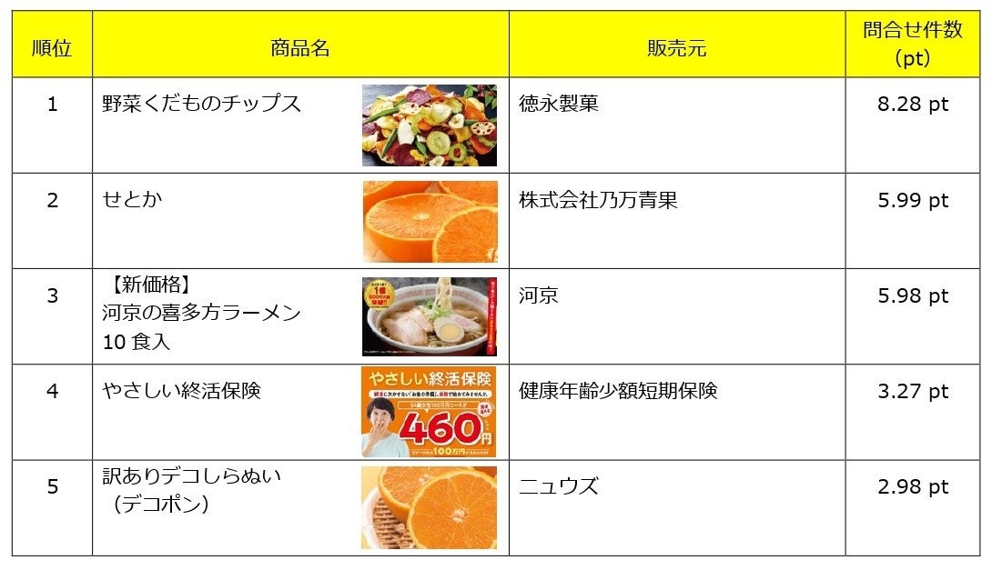 | ・2021年から引き続き、果物(柑橘類やりんご)や甘味(チップスや葛もち、かりんとう)、麺類(ラーメンや味噌煮込みうどん)といった商品が上位に並び、トップ20のほぼ全てを食品が占めました。 ・上半期の特徴として「新茶ゆめいぶき<予約><販売開始>」(10位)、「新茶(5月~)」(12位)と、新茶が2商品ランクインしました。 旬のある商品は、旬の時期に大きくお問合せ件数を伸ばしています。 ・食品がトップ20のほぼすべてを占める中、食品以外では唯一「やさしい終活保険」が4位にランクインしました。「やさしい終活保険」は、1月~6月の間、問合せ件数が突出して多い月はなかったものの、全ての月でコンスタントに問合せがあり、4位にランクインしました。 |