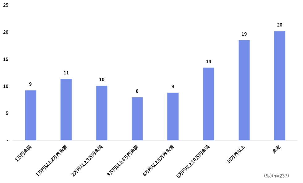 新NISA制度を利用予定の方に投資予定の月額を聴取したところ、「未定」を除くと「10万円以上」が19%で最も高かった。つみたて投資枠において、非課税で投資できる限度月額に当たる10万円(年間非課税投資枠120万円)を少なくとも投資したい意向がうかがえた。