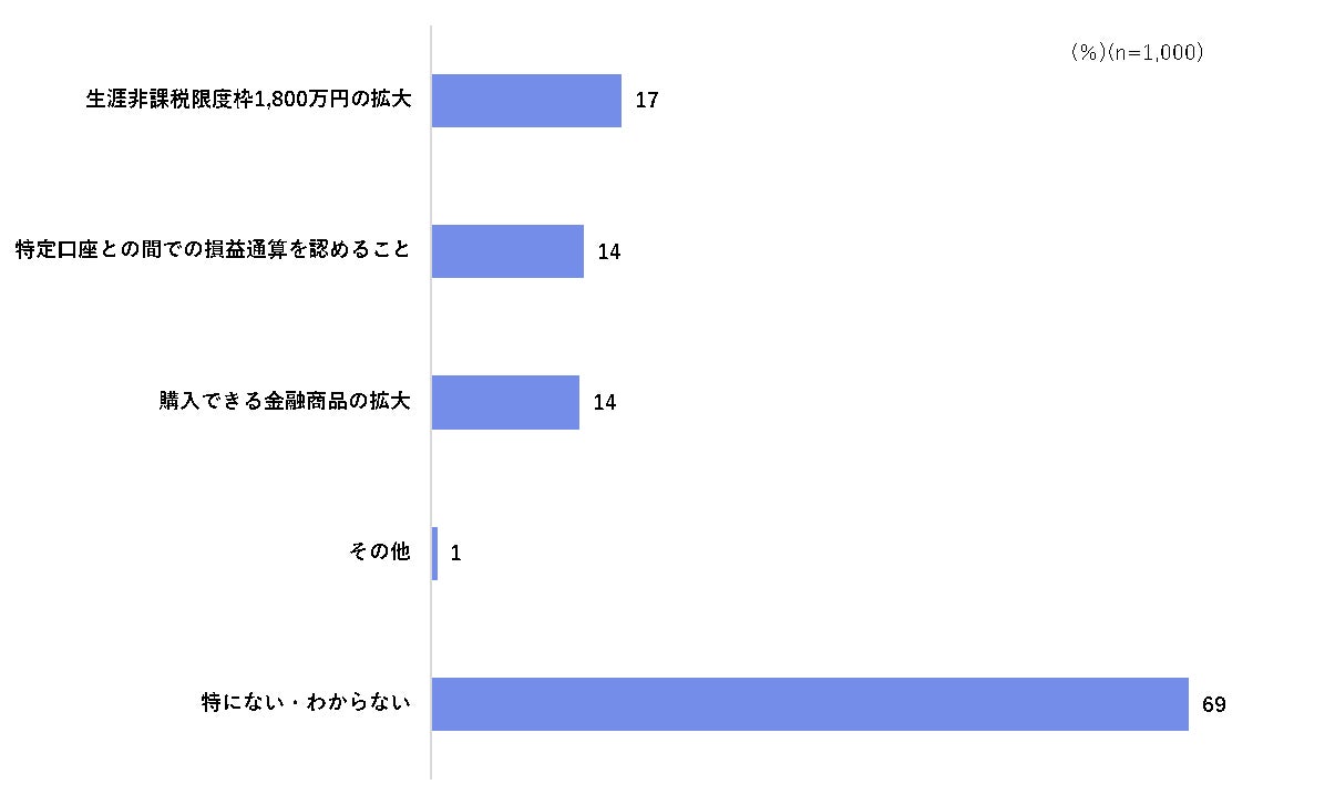 新NISA制度について、改善が必要と考える点を新NISA制度を知らない方も含め聴取したところ、「生涯非課税限度枠1,800万円の拡大」が17%となった。