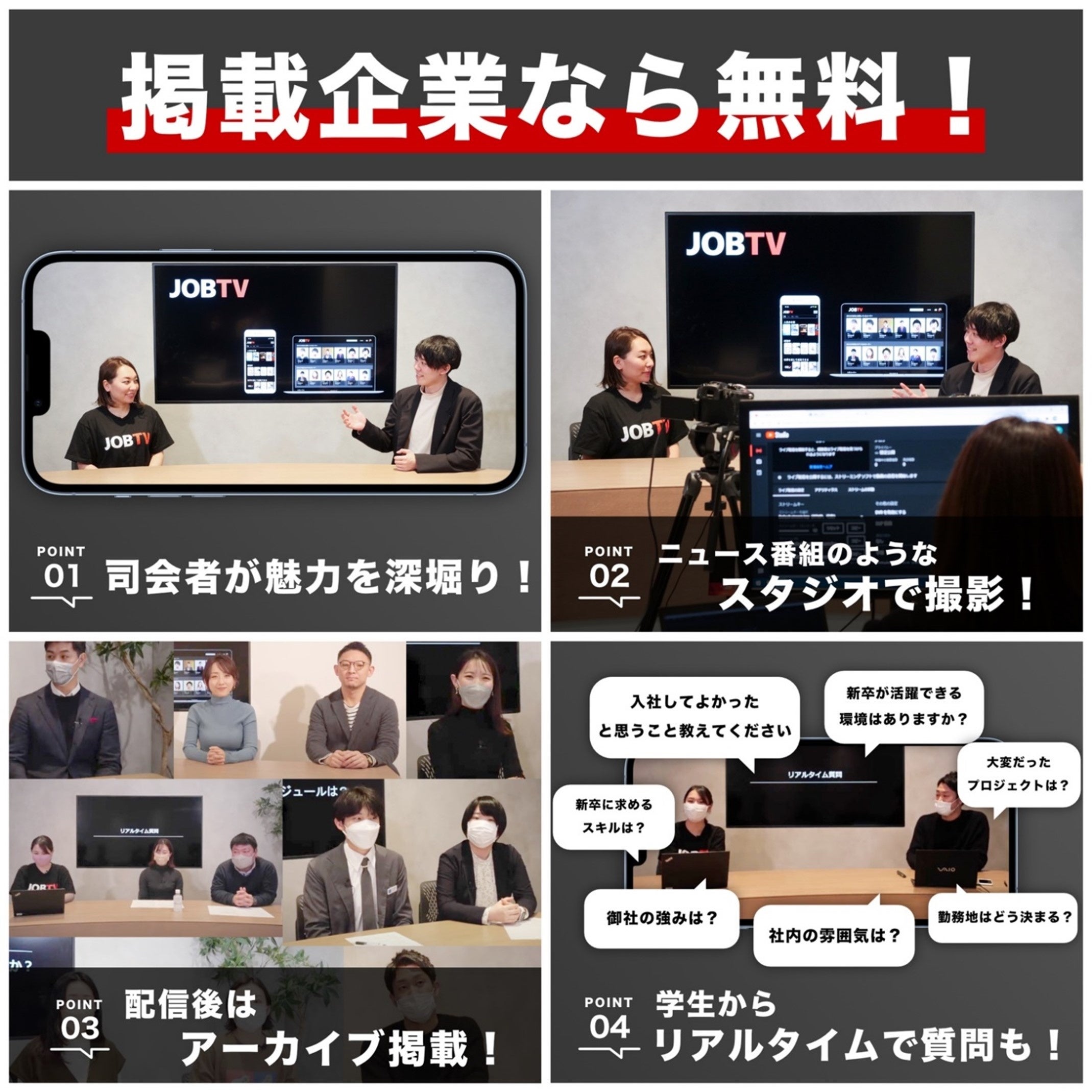 昨今、コロナ禍による急速なオンラインシフトもあり、企業の採用活動において、動画による情報発信は欠かせないものになってきています。しかし、「ライブ配信を行いたいけど、設備がない、配信方法が分からない」、もしくは、動画で発信しても、学生のニーズと合っておらず全く見られない、という企業様も少なくありません。「JOBTV LIVE」は学生の声を元に、実績豊富な司会者や配信スタッフが“見たくなる採用動画”の制作をサポートいたします。また、サービス開始記念として、JOBTV掲載企業限定で、無料キャンペーンを実施いたします。ライブ配信のご希望があった際には、無料でライブ配信~アーカイブ動画納品までサポートさせていただきます。