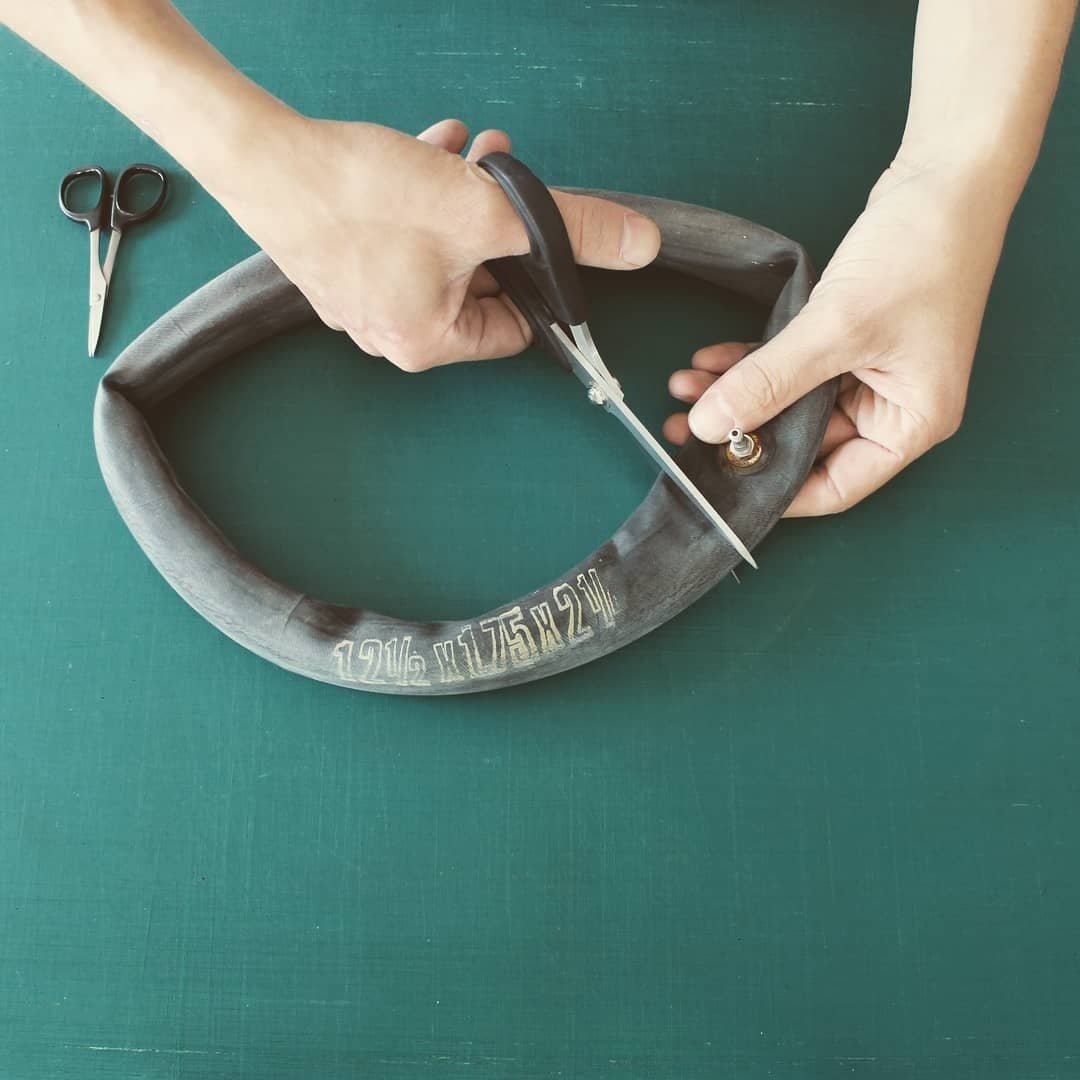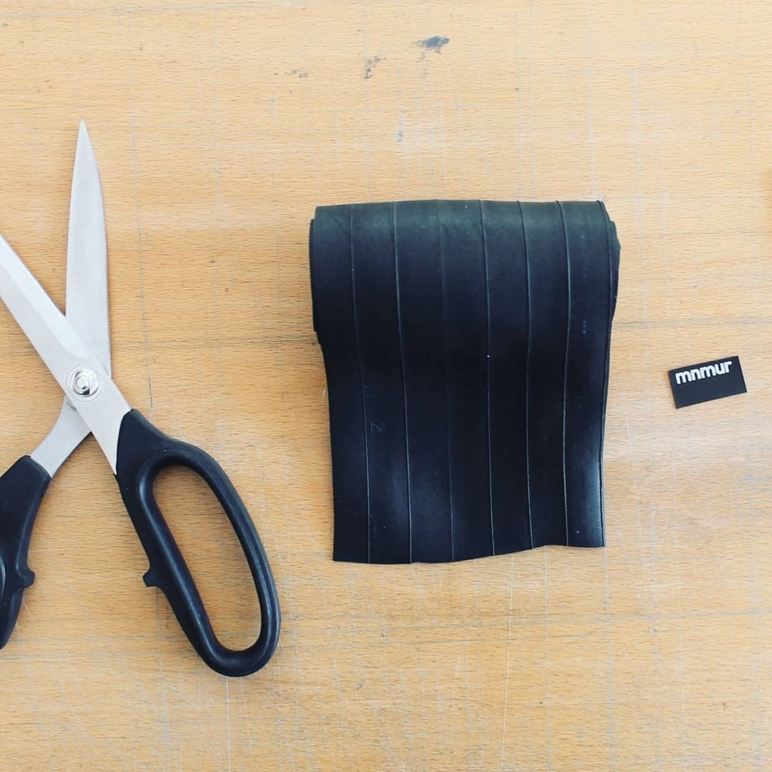 Mnmurでは、廃棄されるタイヤチューブから製品として利用可能な部分を選び、十分な洗浄を行い制作しています。